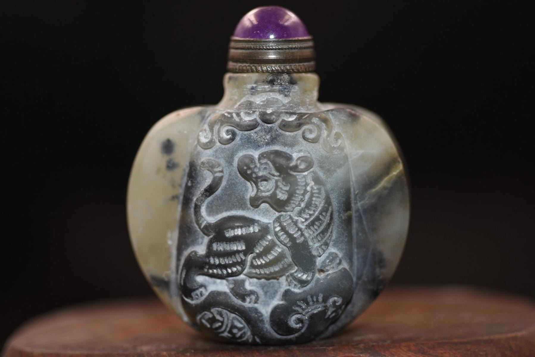 Chinese Hand carved Tiger 2.4 inches Jade snuff bottle Description: This item is very Rare Chinese antique snuff bottle. material is Jade. Excellent workmanship, exquisite. Its height is about 2.4 inches.
