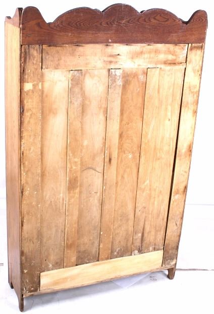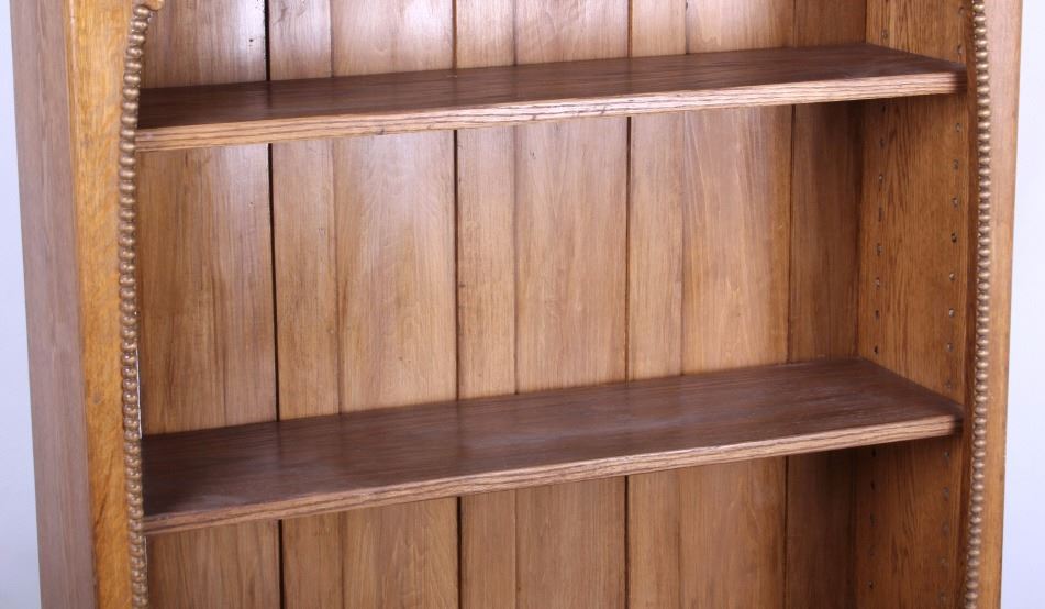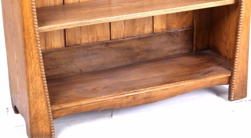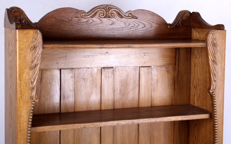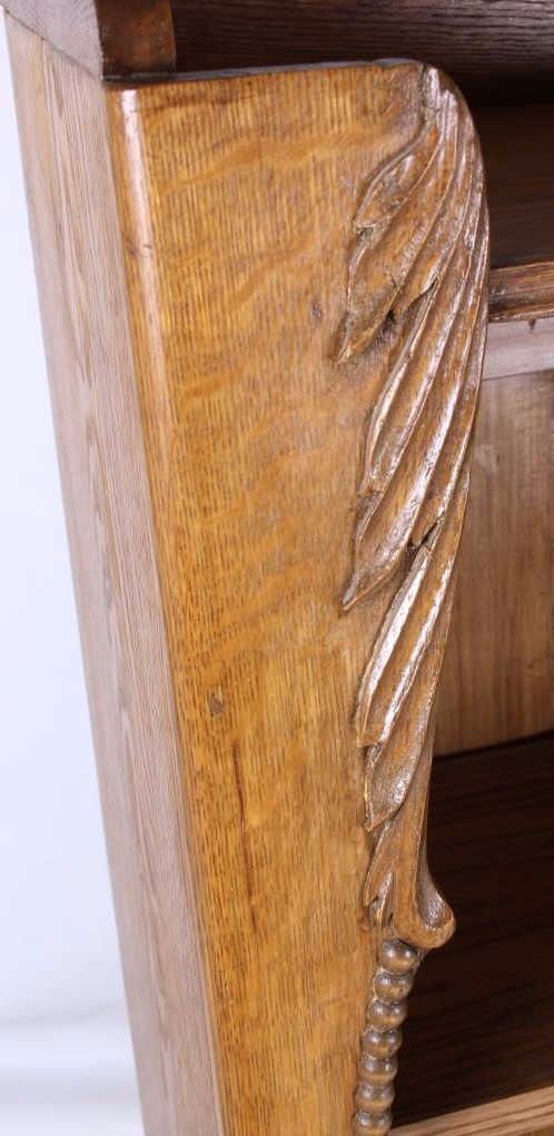 This lot features a hand carved antique oak book shelf. This book shelf has three movable shelves and two fixed ones. It has wonderful accent carvings that make it stand out. It is in fair condition, it has some panel splits and the back feet seem to be worn down. It measures 60" H x 36" W x 12" D