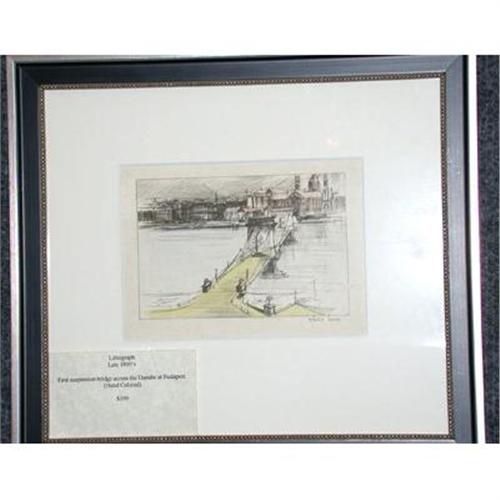 Hand colored lithograph originally printed in perodical of the time. Books and magazines made this an art never matched during the 19th century. A unique and original print. This was a scene from 1890's Budapest showing the first suspension bridge across the Danube river. Litho measures 6.0" x 4.0" and has a total framed measure of 11.0" x 10.5".