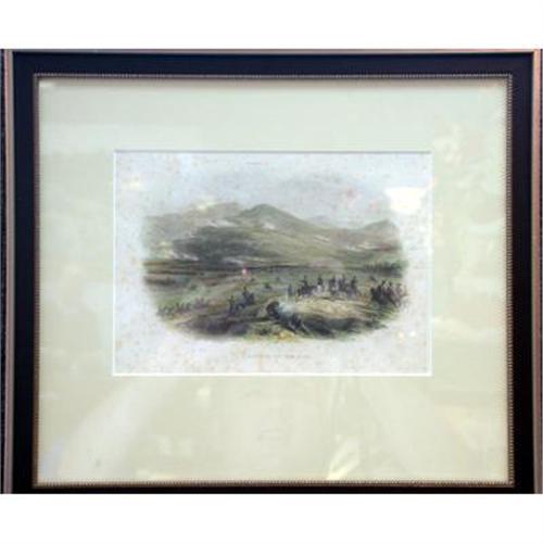 Hand colored lithograph originally printed in perodical of the time. English books and magazines made this an art never matched during the 19th century. A unique and original print. This was a scene from the Battle of Alma during the Crimean War. This particular scene showed the Russian lines. Framed and matted on acid free paper. Litho shows waterspots but is still in overall great condition. Litho measures 8.5" x 6.0" and has a total framed measure of 14.0" x 12.5".