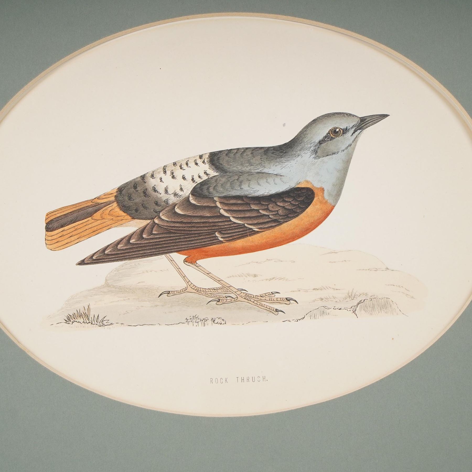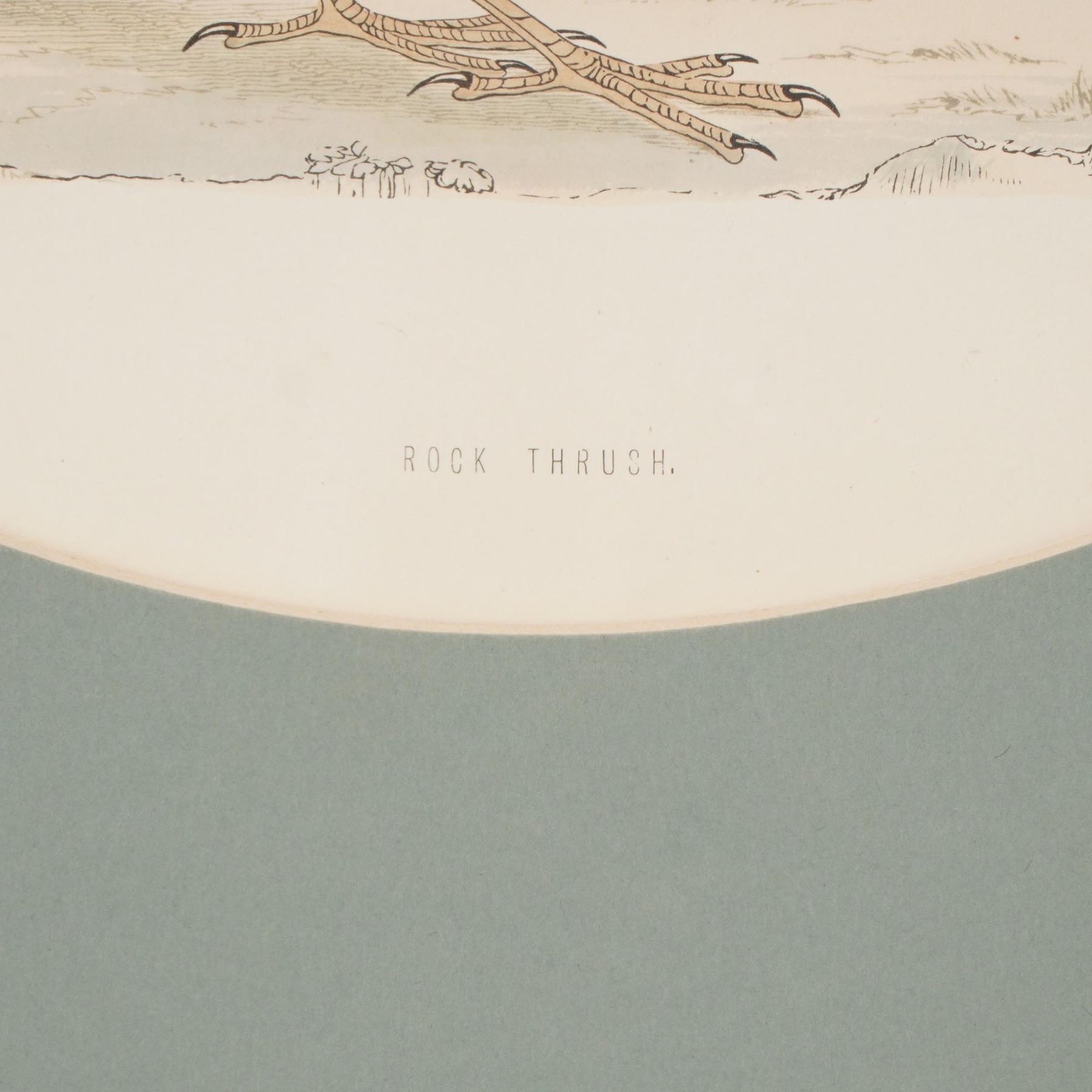 Delicately rendered 19th-century hand-colored lithograph of a Rock Thrush, featuring vibrant plumage with vivid rust-orange, slate blue, and warm brown tones. Likely originating from an antique ornithological volume, this naturalist print captures the elegant posture and distinct coloring of the bird in a minimal landscape setting. Professionally presented in an oval-cut green mat, the print is lightly affixed with archival tape. A classic example of traditional bird illustration suitable for collectors or decor.