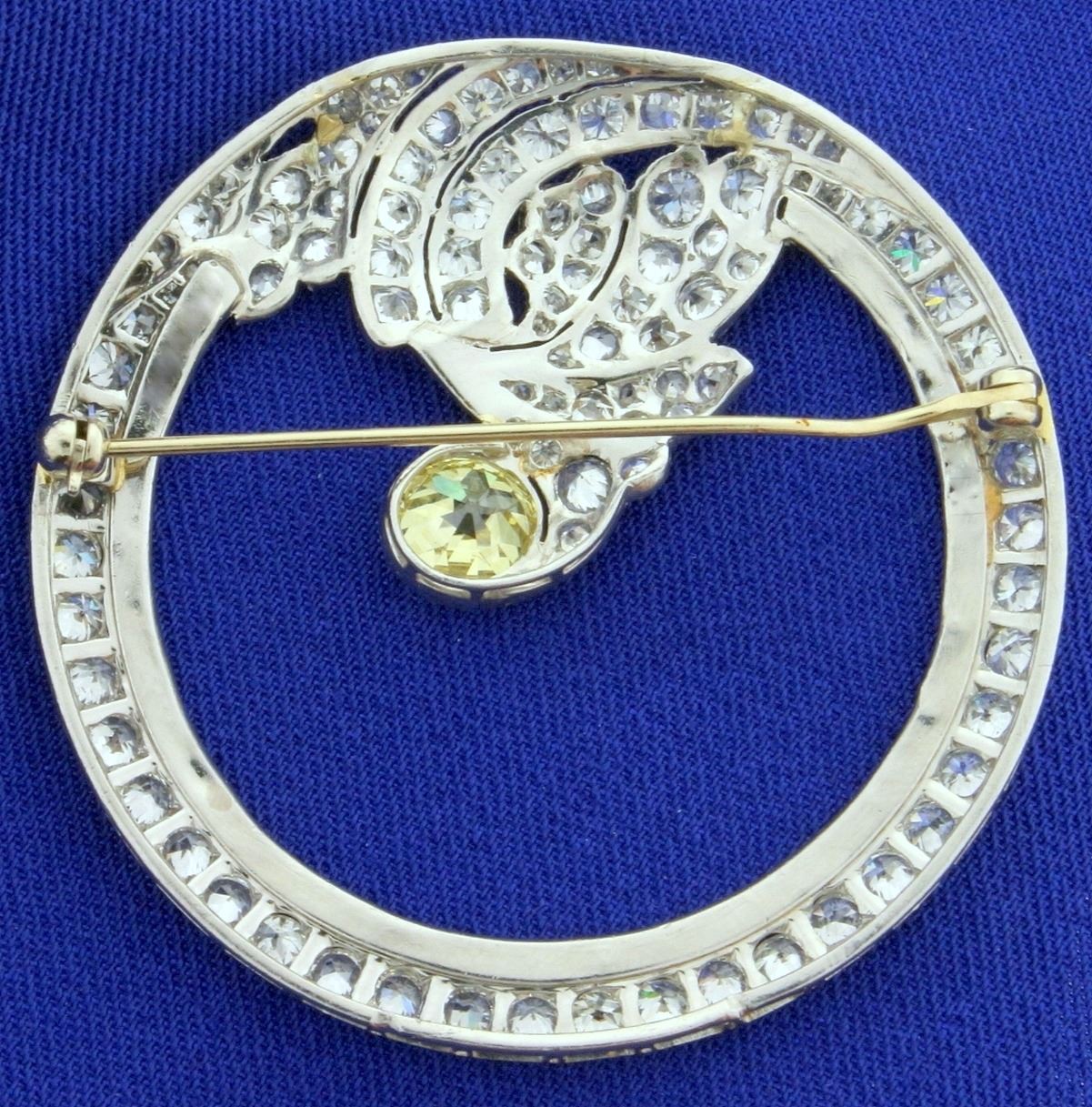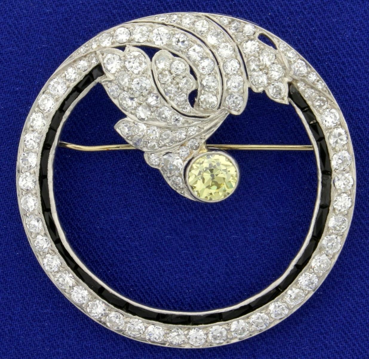 In Platinum. Contains a center diamond approximately 1.5ct, European Cut Fancy yellow diamond with VS clarity and vibrant yellow color. Also contains approximately 7cts of very high quality European cut diamonds of VS clarity/G color. Accented by onyx gemstones around inside perimeter. 1 7/8 diameter. 13.4g.