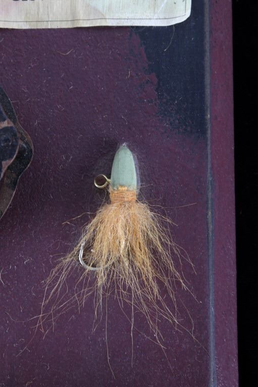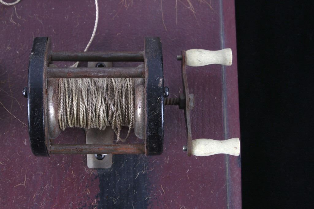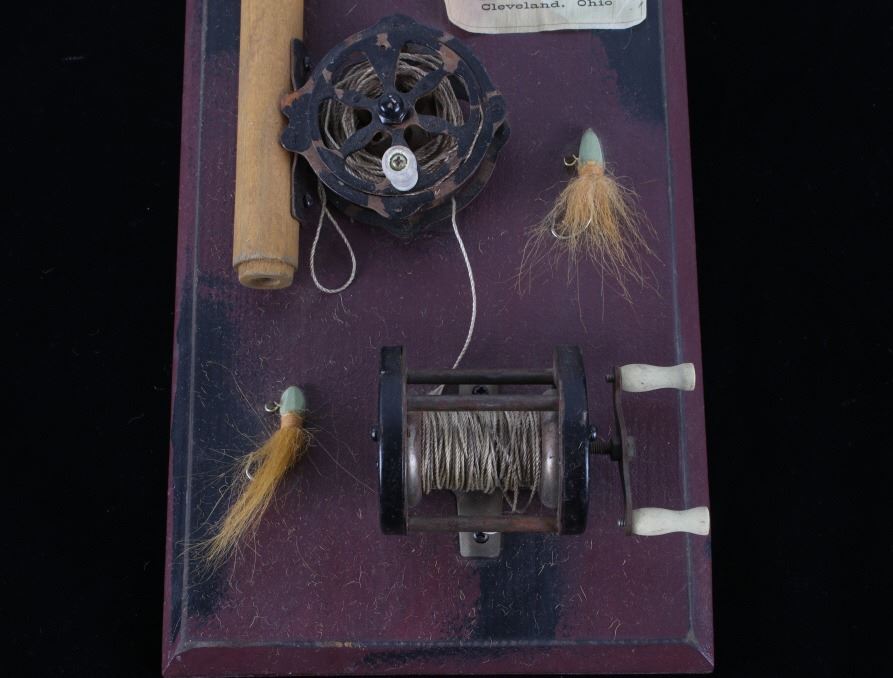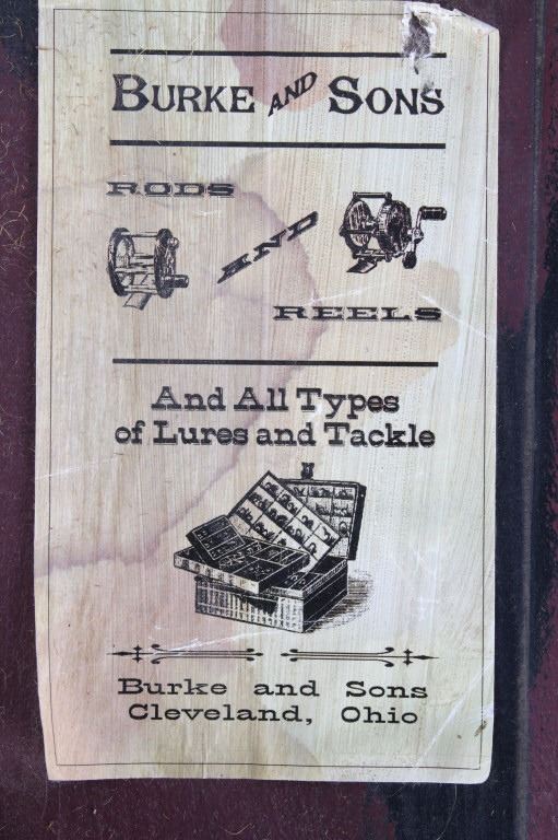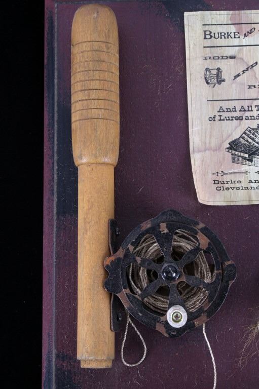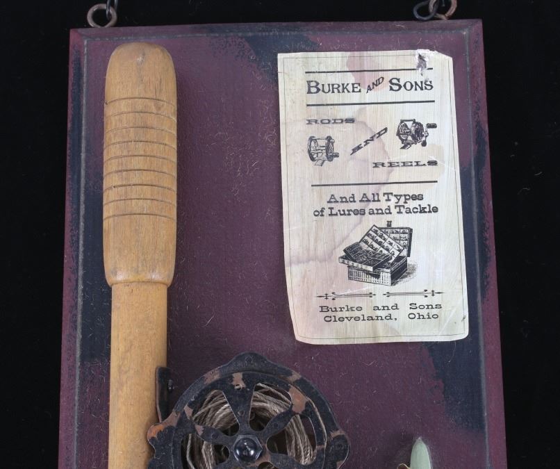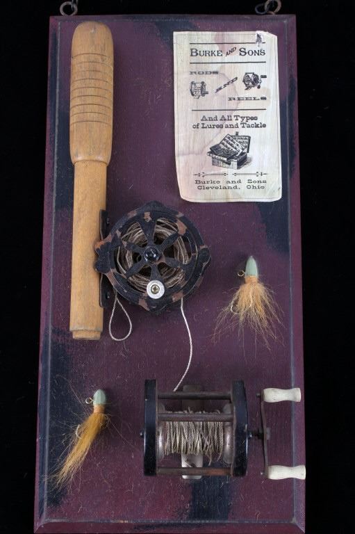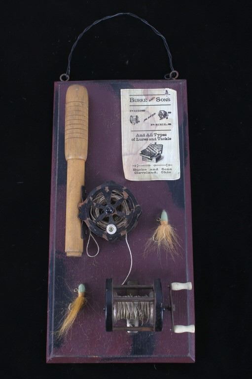 Offered in this lot is a hand crafted wall hanging. The hanging is a painted board with a small paper that reads "Burke and Sons Rods and Reels and all types of lures and tackle Burke and Sons Cleveland, Ohio". Also on the board is a fishing rod grip with a fly reel, two lures, and a spinner reel. The board hangs from rustic wire. The board measures 14 1/2" x 7" x 1". This wall hanging is in good condition and will be a great addition to any cabin or man cave.