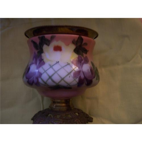 This is a beautiful lamp base.Hand painted flowers.The base is a metal material possibly brass .I have collected these for some time,as I put floral blocks in them and use them for flower arrangements.They are absolutely gorgeous that way.This is a large size measuring approx. 9 1/2" tall.It is approx. 8" across the widest part of the glass.No chips or cracks.I have another one I will be listing also as I am running out of room.