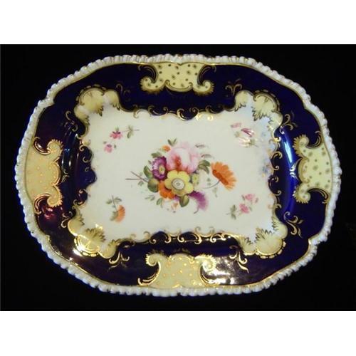 Antique English Porcelain Hand-Painted Cake Serving Plate. Circa. 1860 - 1880 Fine flower bouquet in center, cobalt blue borders with ivory color cartouche inserts. Delicate gold decoration, molded gadrooned and scalloped edge. Some wear in the applied gold, and a few minor chips on bottom foot rim, consistent with the age. No maker's mark (generally, only one or two of the larger pieces in set of porcelain would receive a marking, the others would not). In very good condition.