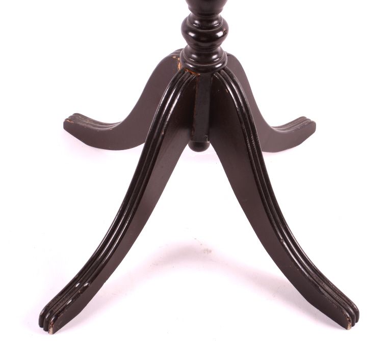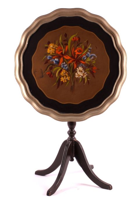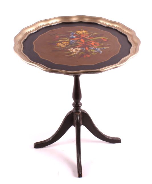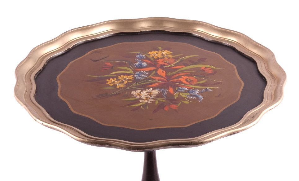 This lot features an antique hand painted tea table. The table was made by Lefkow-King Company. The top has a painted floral design with bright, vivid colors. The tea table is in very good condition. It measures 21.5" and is 23.5" tall.