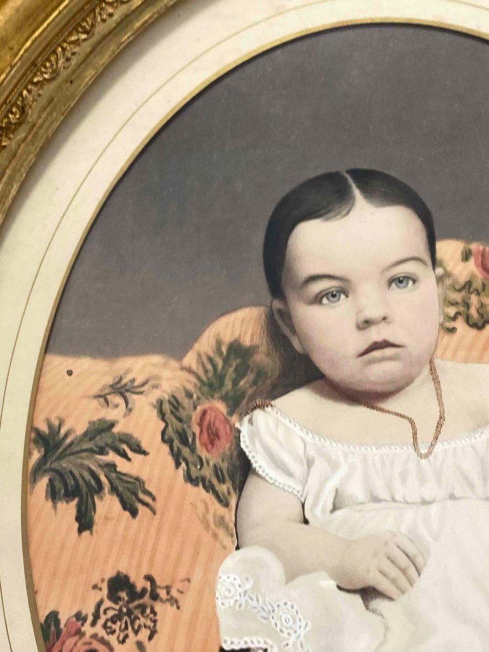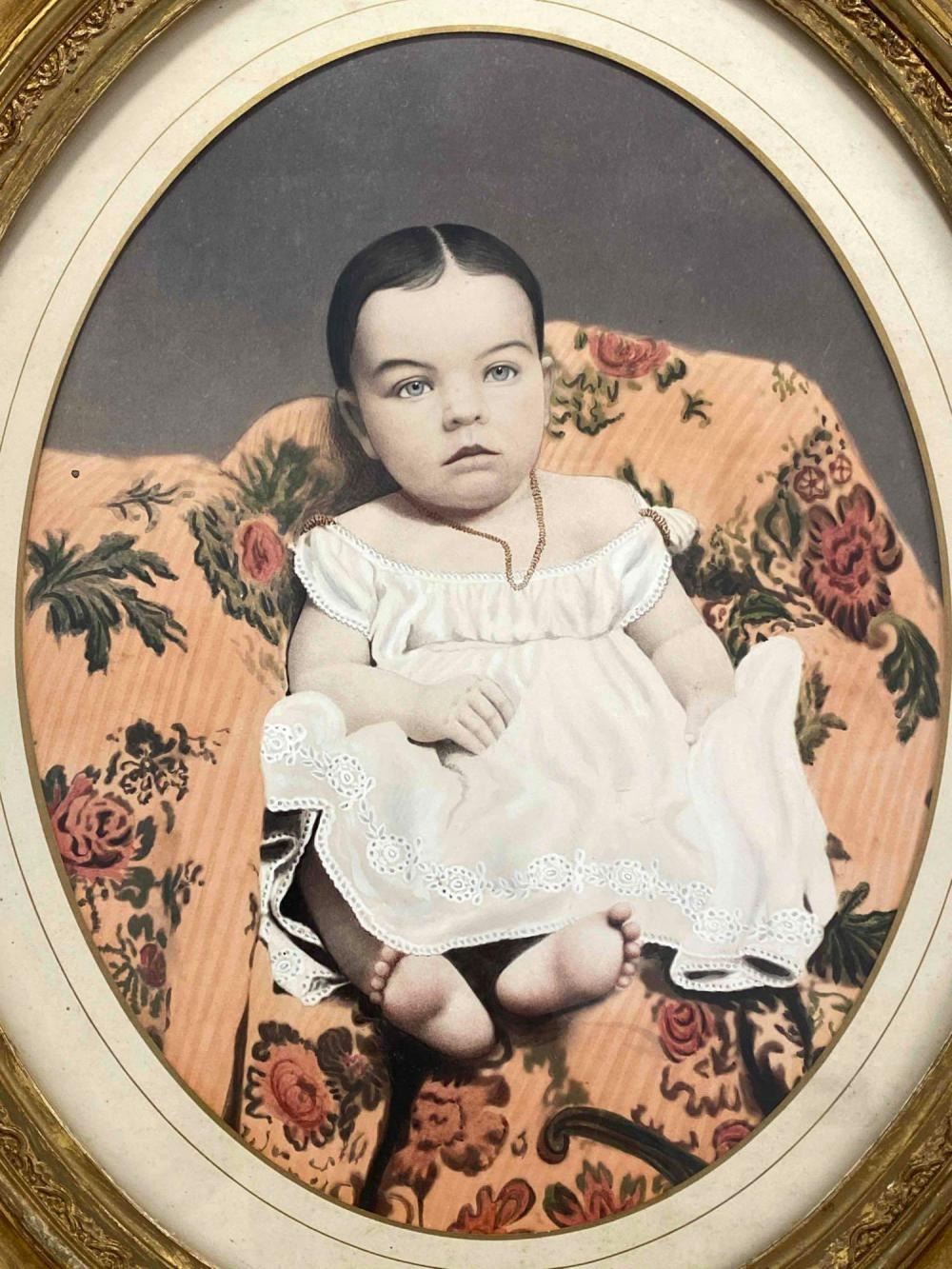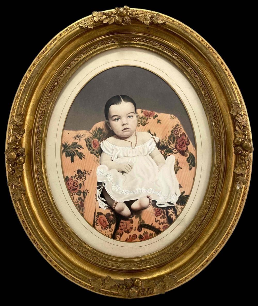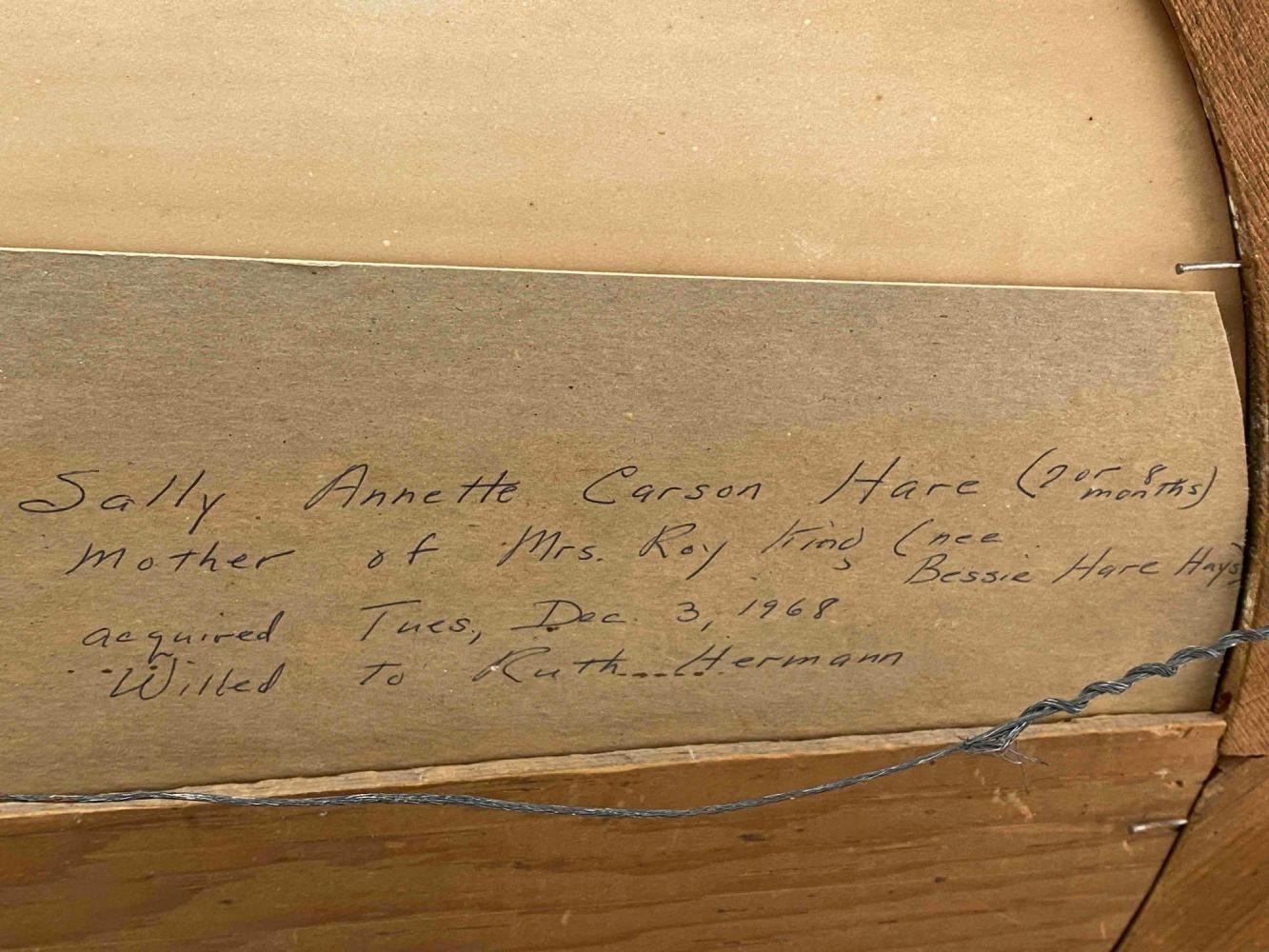 Antique Hand Tinted Photo Baby Girl In Gilt Frame. Back Inscribed "Daughter Of George Carson (Cousin Of Kit Carson)" And "Sally Anette Carson Hare (2 or 8 months) Mother Of Mrs. Roy Kinds (Nee Bessie Hare Hays) Acquired Tues. Dec 3, 1968 Willed To Ruth Herman" Approximately 21.25L x 18.0W in. Sight Approximately 13.0L x 10.0W in.