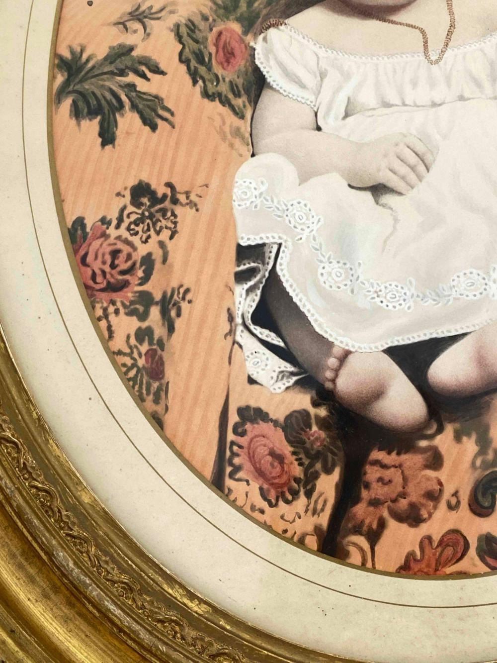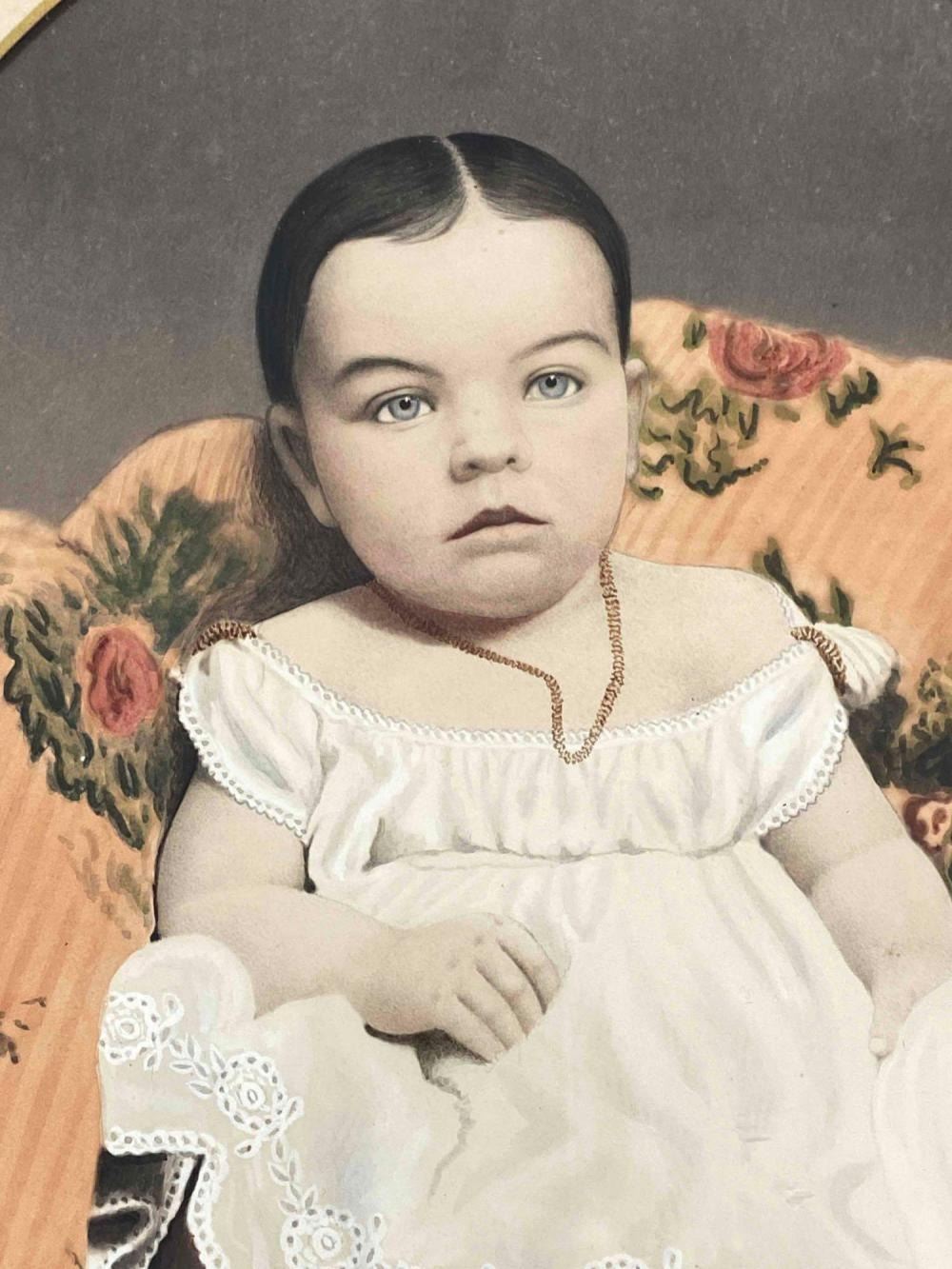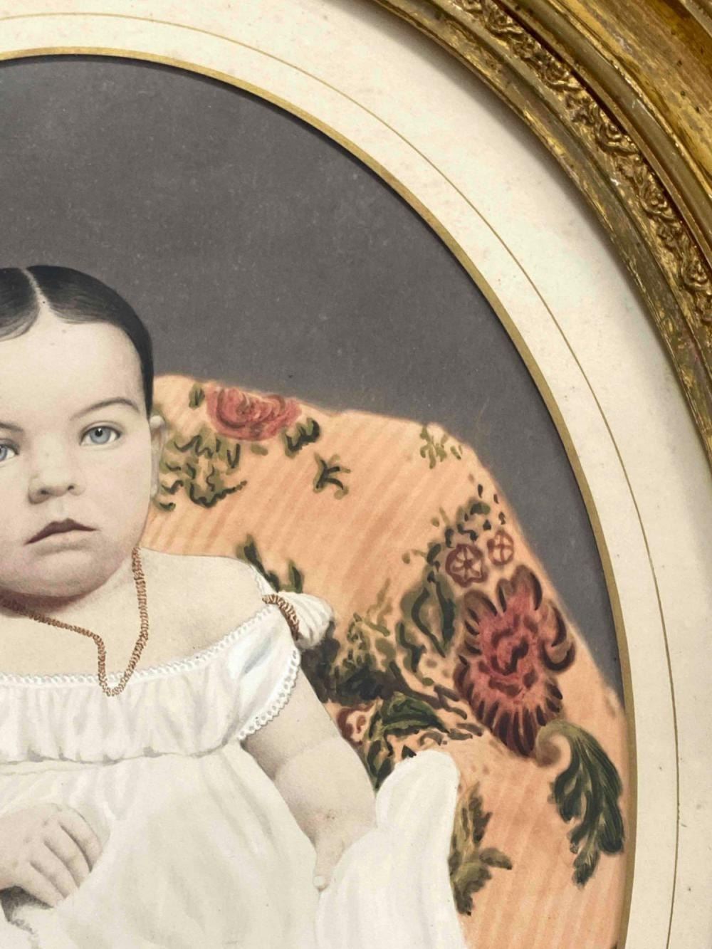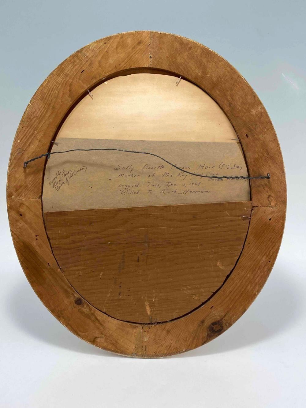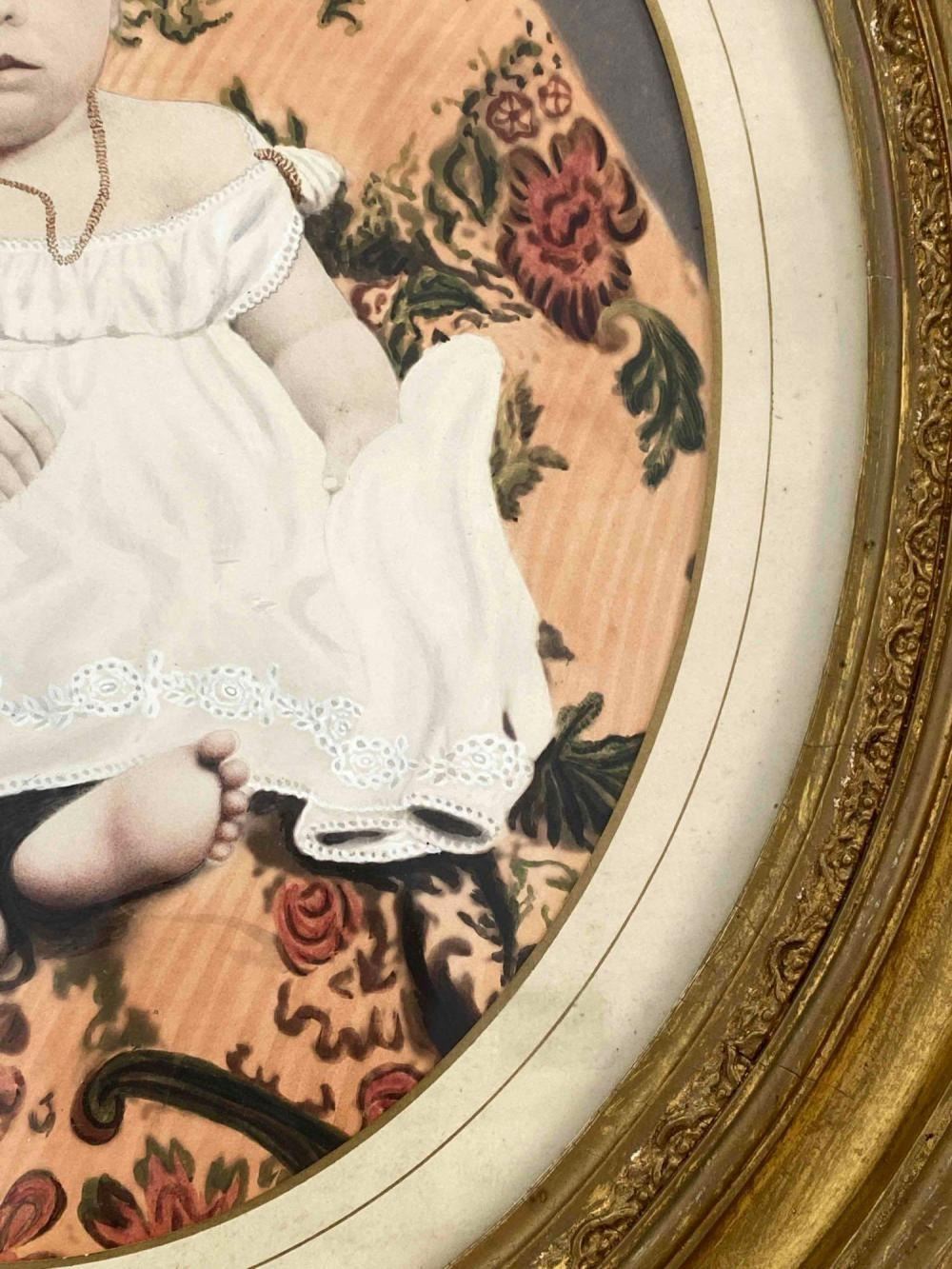 Antique Hand Tinted Photo Baby Girl In Gilt Frame. Back Inscribed "Daughter Of George Carson (Cousin Of Kit Carson)" And "Sally Anette Carson Hare (2 or 8 months) Mother Of Mrs. Roy Kinds (Nee Bessie Hare Hays) Acquired Tues. Dec 3, 1968 Willed To Ruth Herman" Approximately 21.25L x 18.0W in. Sight Approximately 13.0L x 10.0W in.