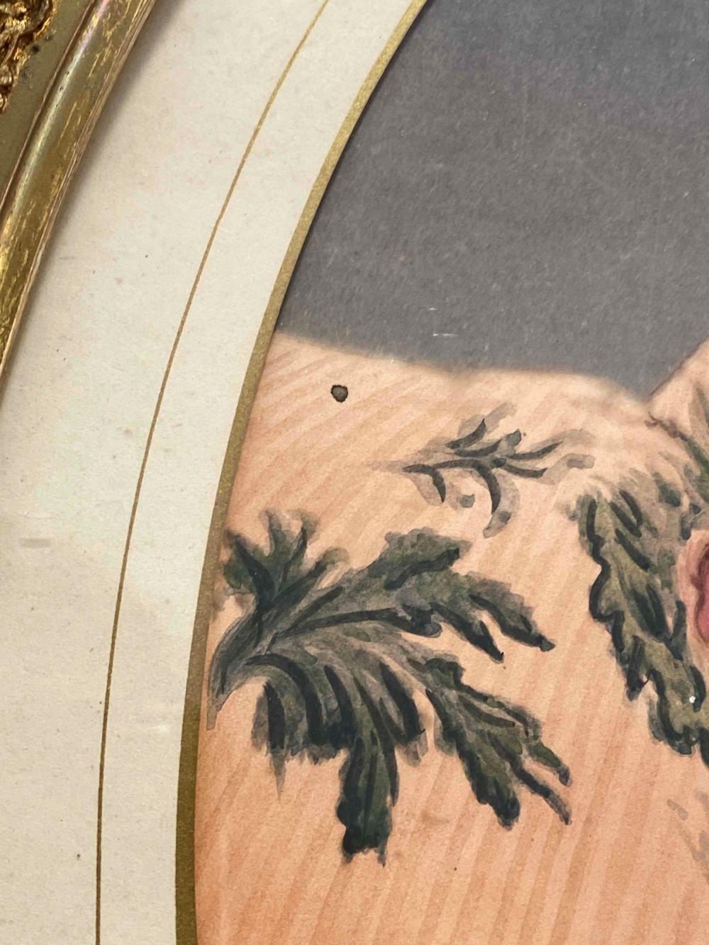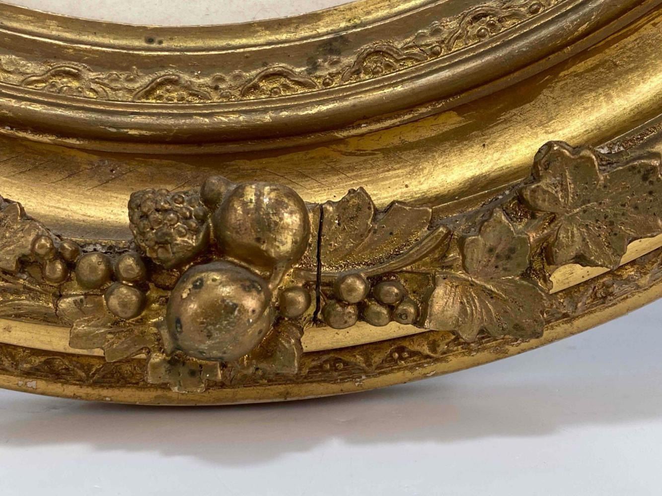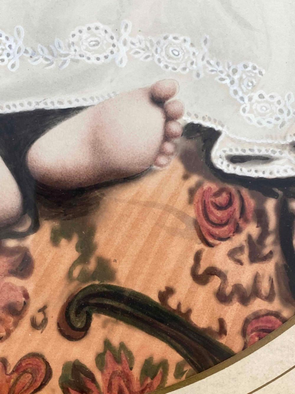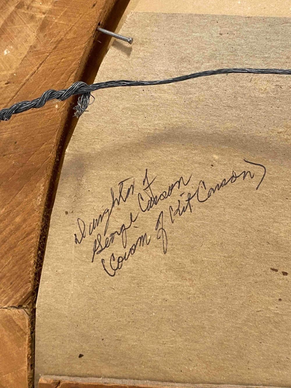 Antique Hand Tinted Photo Baby Girl In Gilt Frame. Back Inscribed "Daughter Of George Carson (Cousin Of Kit Carson)" And "Sally Anette Carson Hare (2 or 8 months) Mother Of Mrs. Roy Kinds (Nee Bessie Hare Hays) Acquired Tues. Dec 3, 1968 Willed To Ruth Herman" Approximately 21.25L x 18.0W in. Sight Approximately 13.0L x 10.0W in.