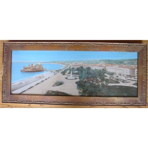 A most unusual antique photograph? of Monte Carlo or Cannes.The original photo appears to be in sepia tones. There is over painting on the sky, water, trees, and hills. Heavy palette used on the front tree and the artist may have taken liberty with the size of the tree. Some crackling to the paint on the large tree in front. There is a number and letters painted on the lower right but they are not totally legible (300 bi?)The photo is housed in a vintage French frame with floral wreaths around the edges. In very good condition with the exception of a 2" area where the edge has been broken.