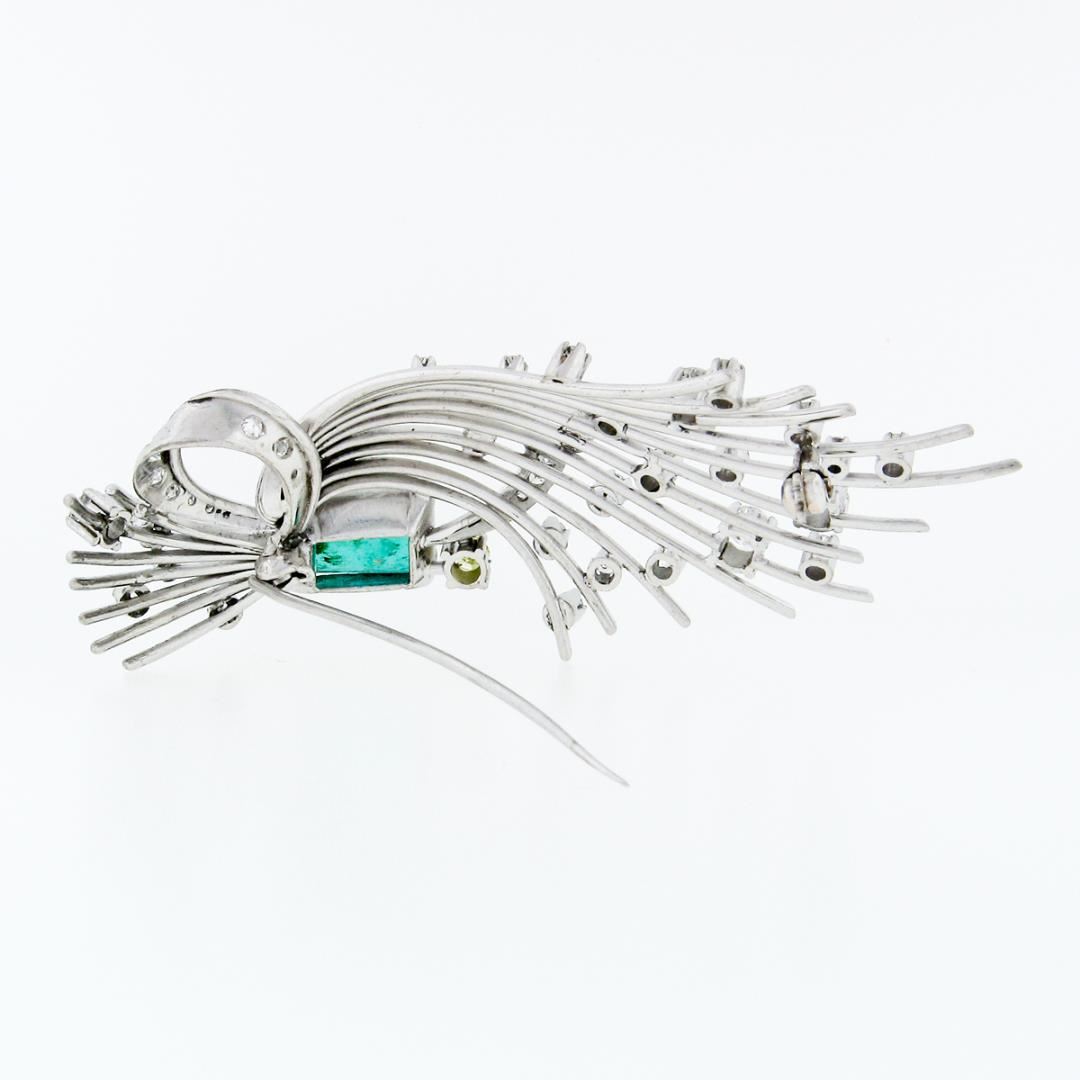 An antique solid platinum wire brooch, with 1 GIA graded step cut natural emerald (4.65ct), and 1 old european cut natural diamond (Fancy Greenish Yellow Color - SI2 ; 0.15ct), with 38 old eurpean, transitional & single cut natural diamonds (G- I - VS2 to SI2 ; 2.50ctw). Measures 72.63x32.9mm and weighs a total of 21.00 grams. Comes with all original relevant certifications.