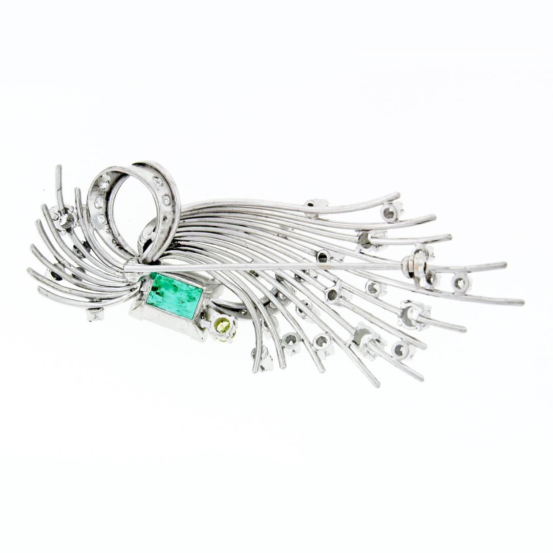 An antique solid platinum wire brooch, with 1 GIA graded step cut natural emerald (4.65ct), and 1 old european cut natural diamond (Fancy Greenish Yellow Color - SI2 ; 0.15ct), with 38 old eurpean, transitional & single cut natural diamonds (G- I - VS2 to SI2 ; 2.50ctw). Measures 72.63x32.9mm and weighs a total of 21.00 grams. Comes with all original relevant certifications.