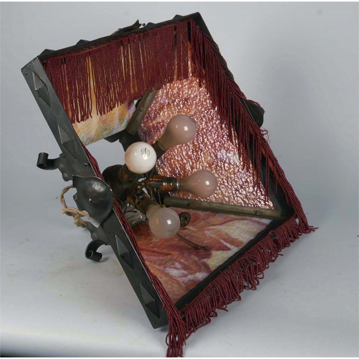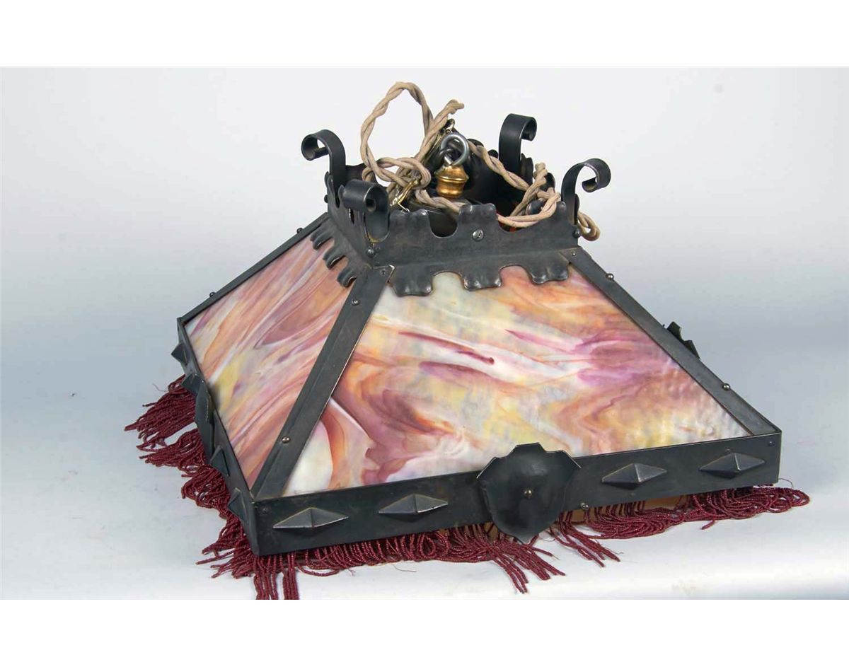 Stained glass lamp with 5" long beaded fringe in a Gothic Medieval design. Has a long cloth cord with a plug on the end and some hanging hardware. Crack on panel. Condition (Very good). Size 20" x 20" x 16"