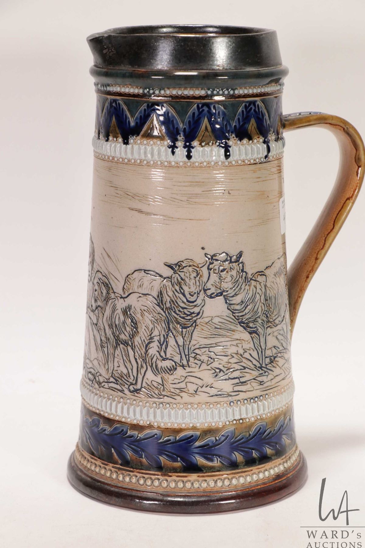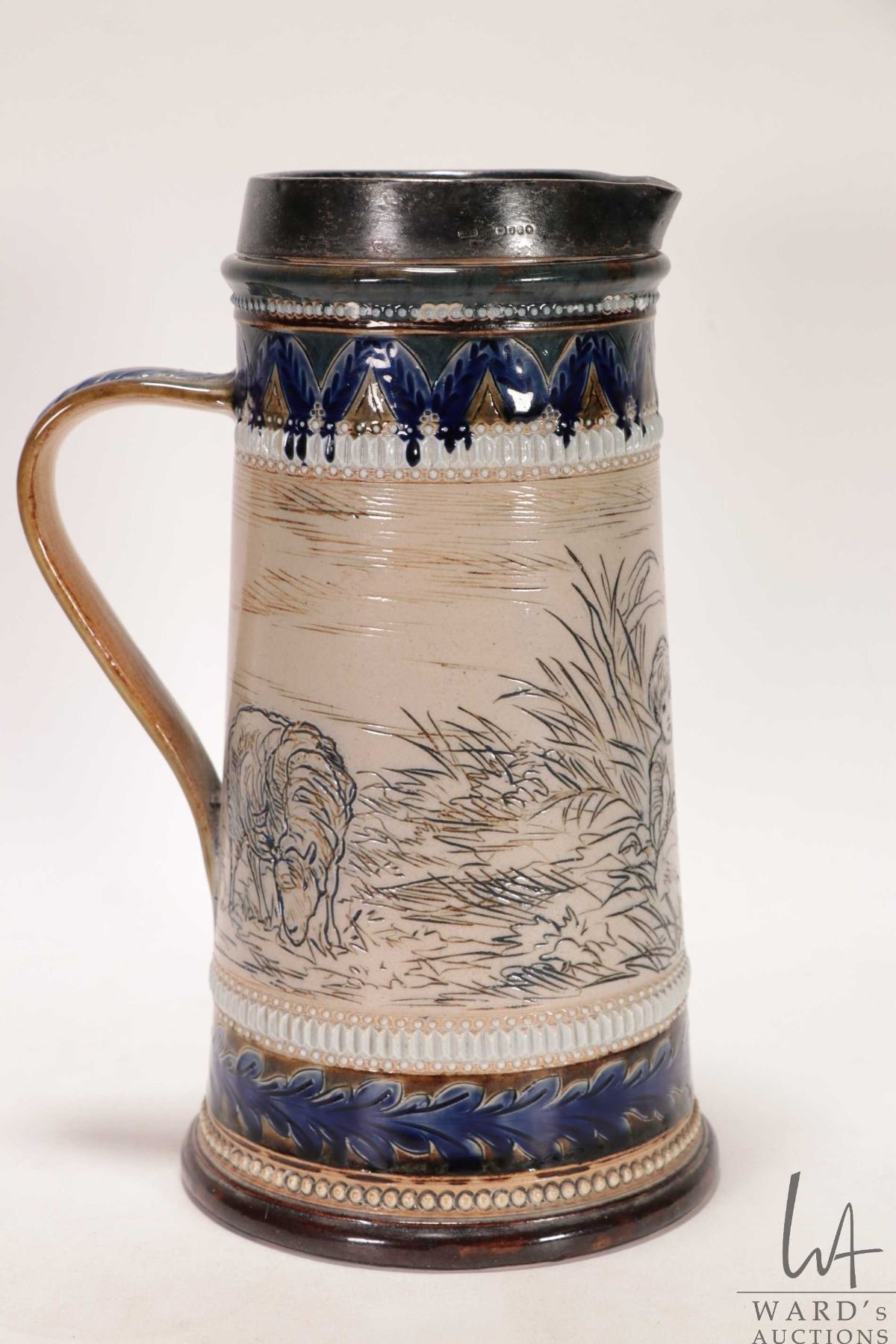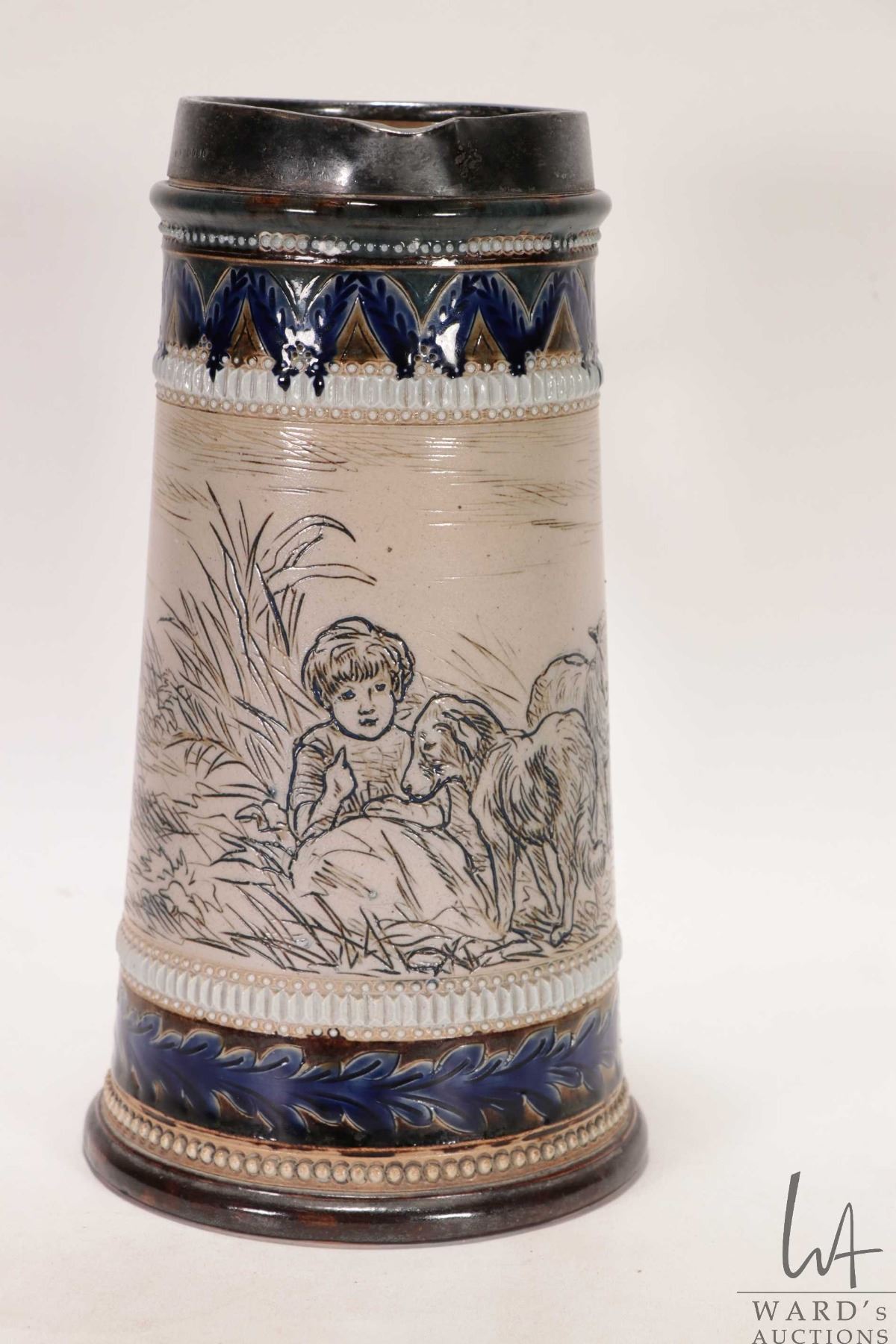 Antique Hannah Barlow, artist signed Doulton Lambeth pitcher with sgraffito scene depicting a child with dog and sheep and British hallmarked sterling silver rim, circa 1880, 9 1/2" in height.