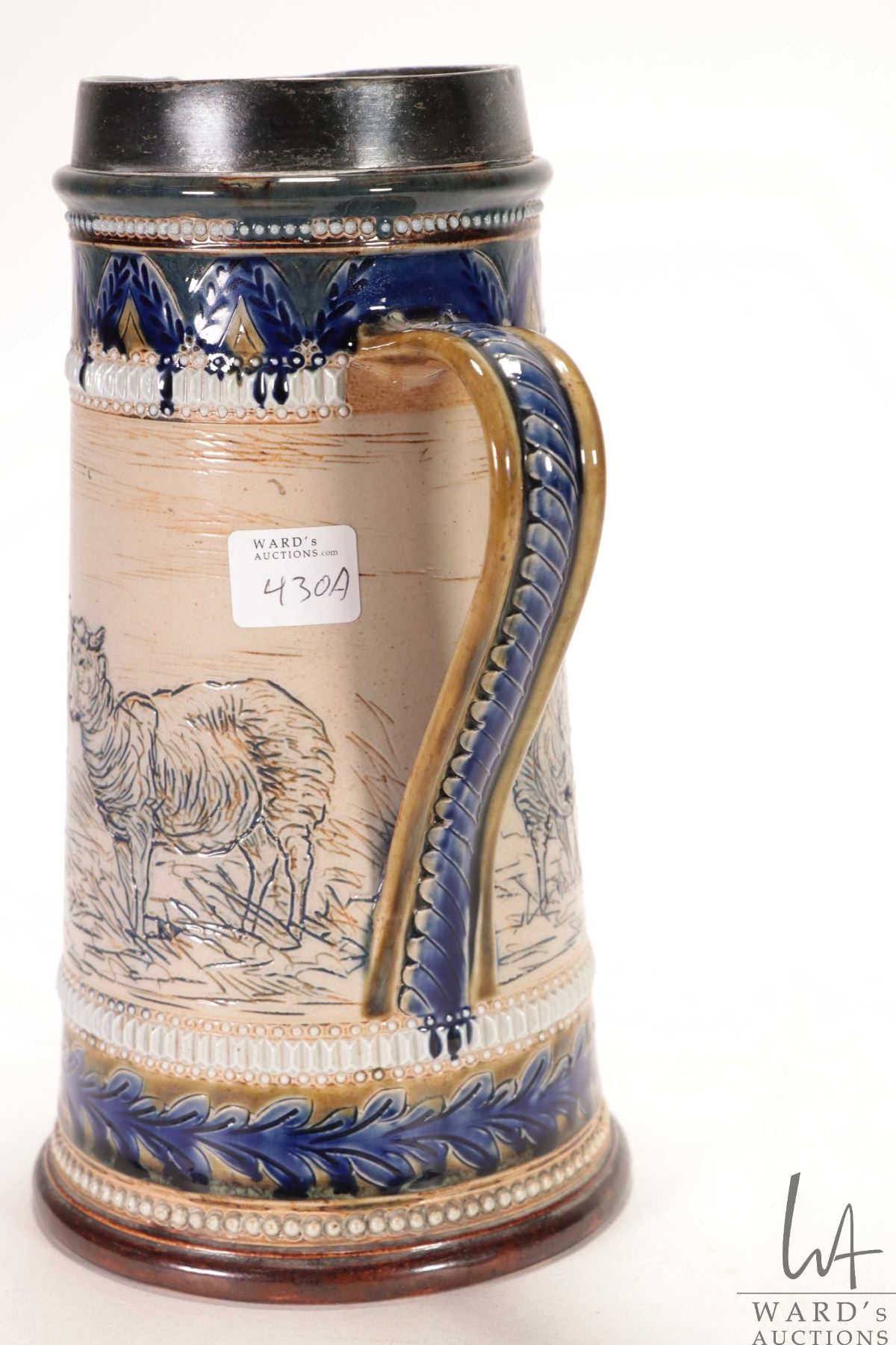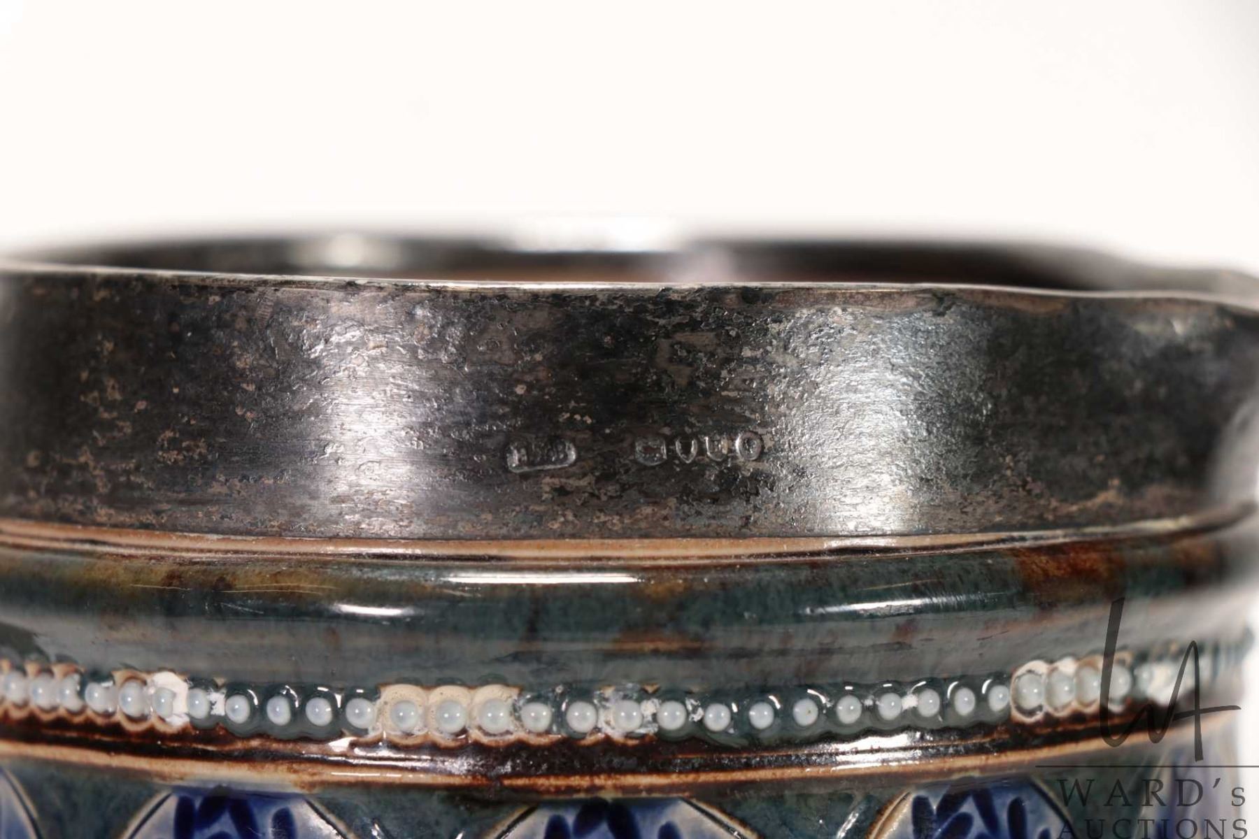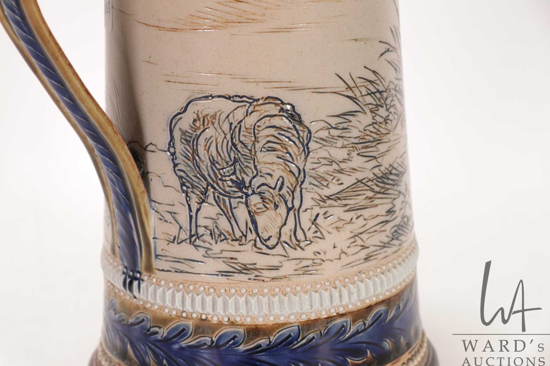 Antique Hannah Barlow, artist signed Doulton Lambeth pitcher with sgraffito scene depicting a child with dog and sheep and British hallmarked sterling silver rim, circa 1880, 9 1/2" in height.