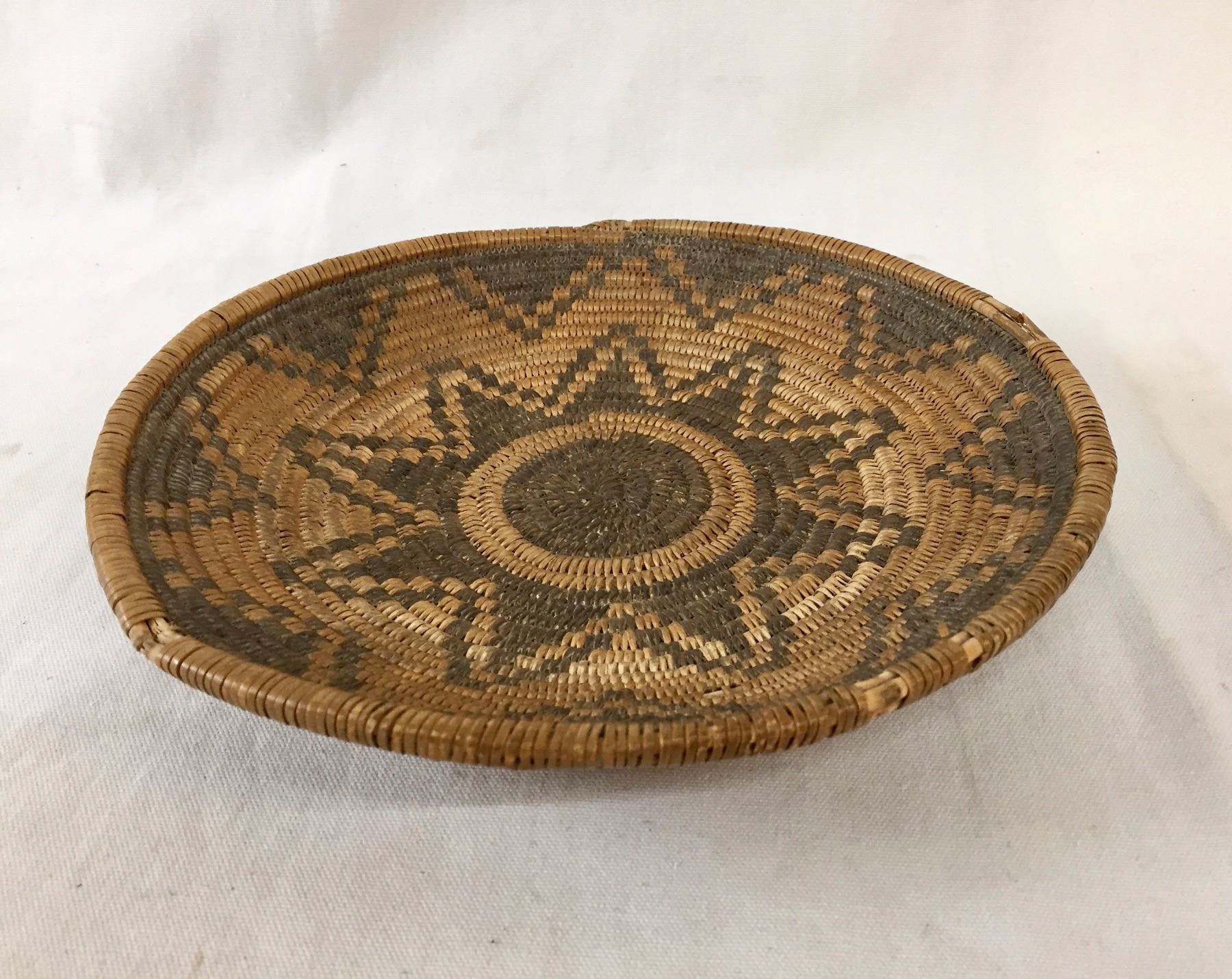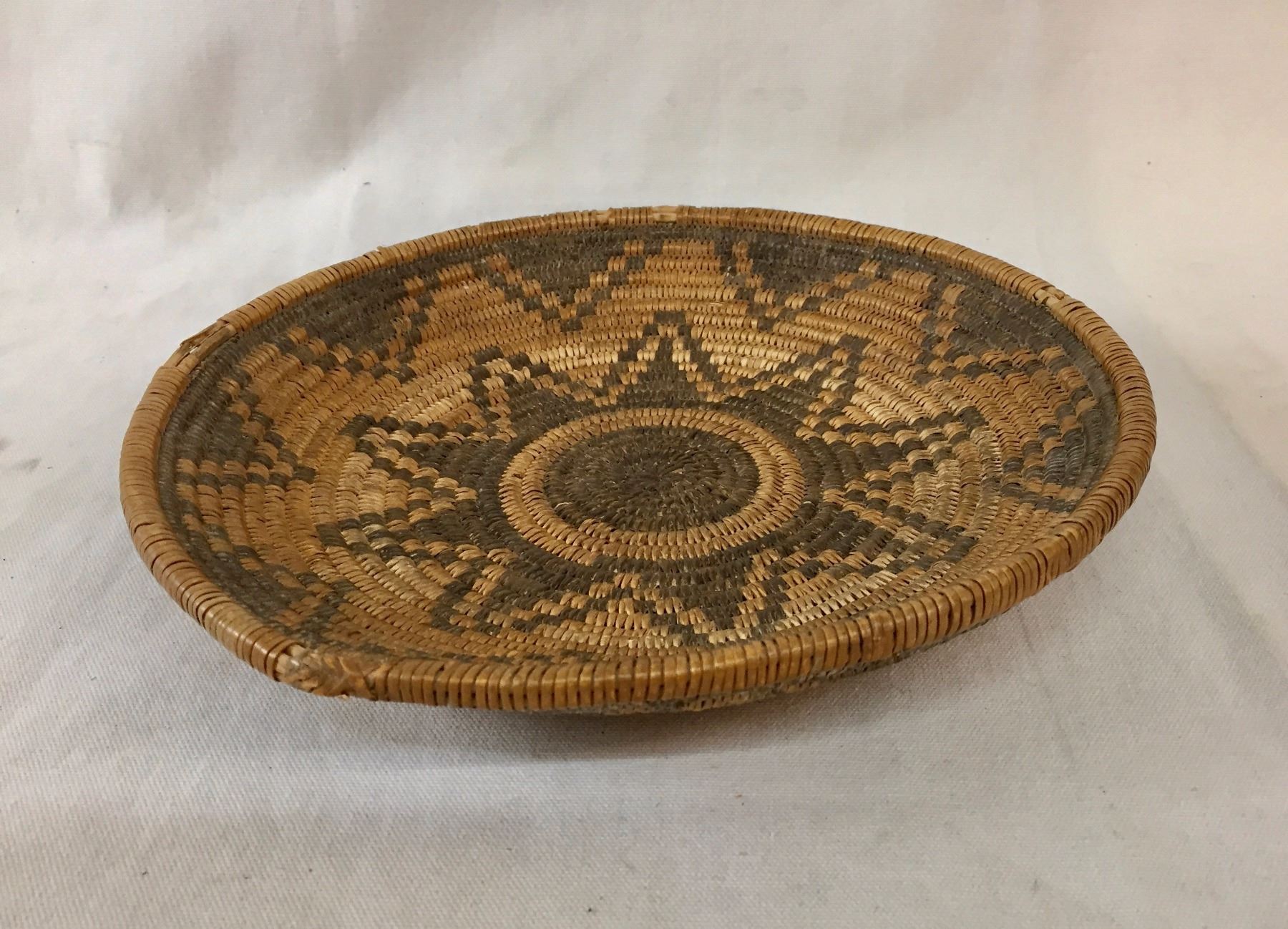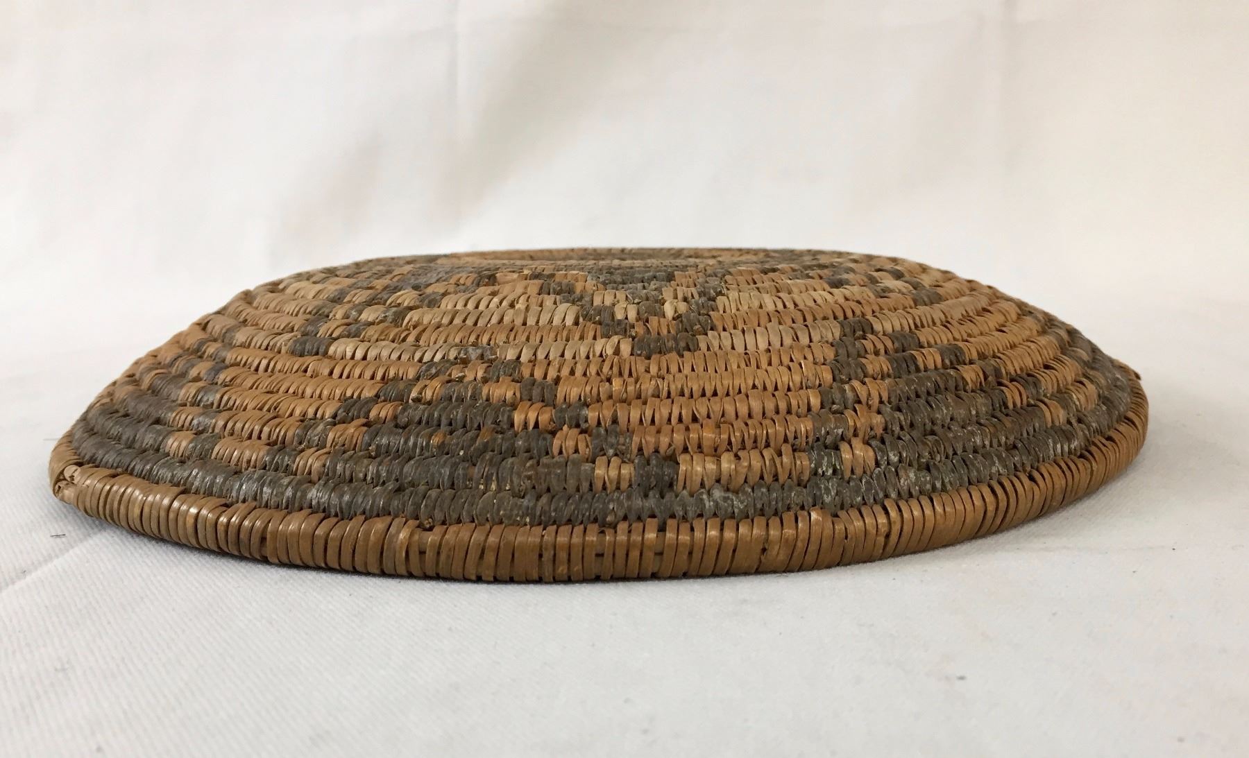 Description: An antique Havasupai basket with a star inside of a star pattern. Maker: Unknown Havasupai Artist. Approx. Age: Circa early 1900s. Size: 10”w x 1-3/4” tall. Condition: Pretty good for its age, normal wear, some stitch loss and a dark patina expected. Please look closely at the pictures - they are an important part of our description. Shipping: There will be a $5 handling / packaging fee for shipping this lot. The actual cost of postage will be added on top of that.
