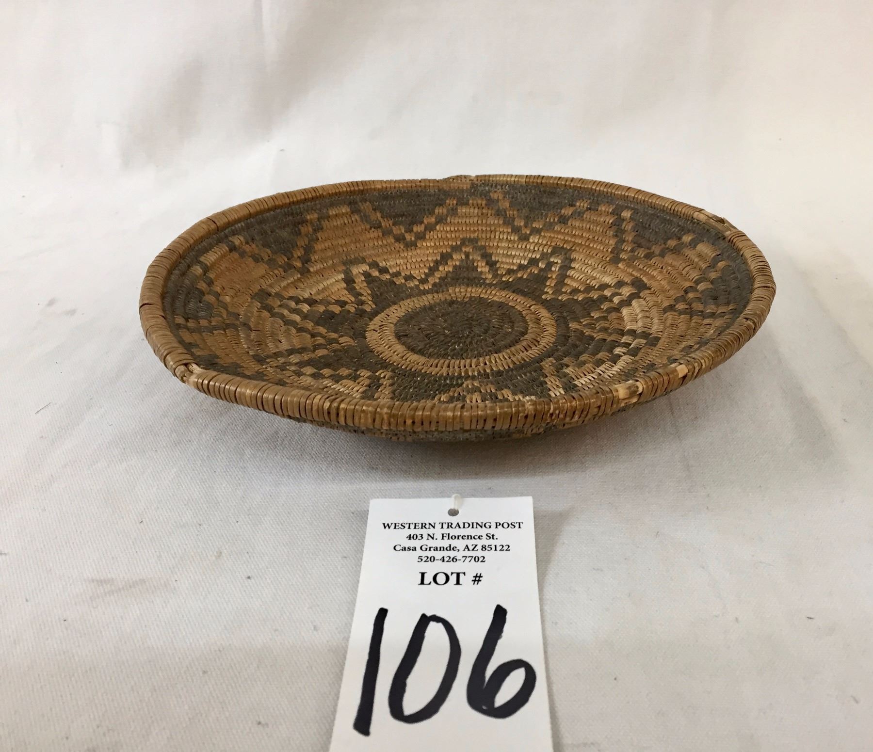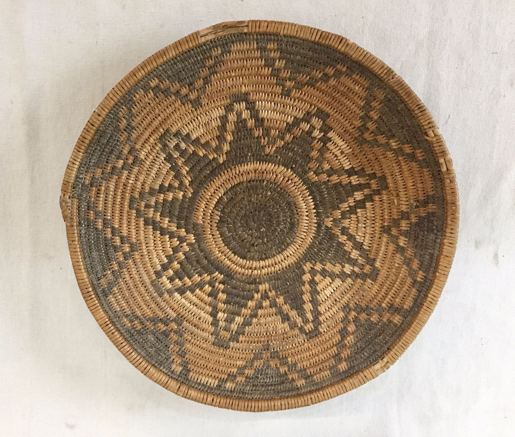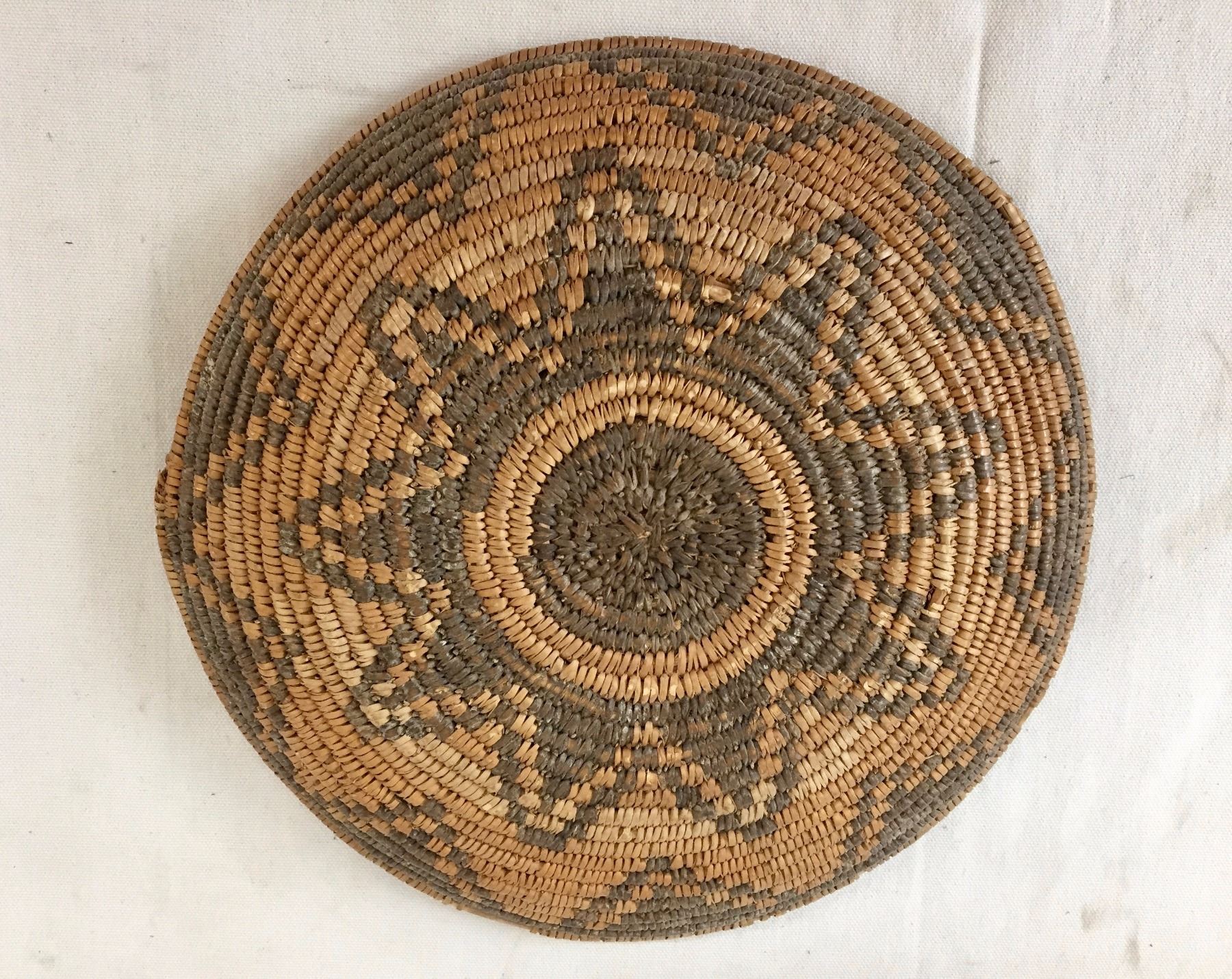 Description: An antique Havasupai basket with a star inside of a star pattern. Maker: Unknown Havasupai Artist. Approx. Age: Circa early 1900s. Size: 10”w x 1-3/4” tall. Condition: Pretty good for its age, normal wear, some stitch loss and a dark patina expected. Please look closely at the pictures - they are an important part of our description. Shipping: There will be a $5 handling / packaging fee for shipping this lot. The actual cost of postage will be added on top of that.