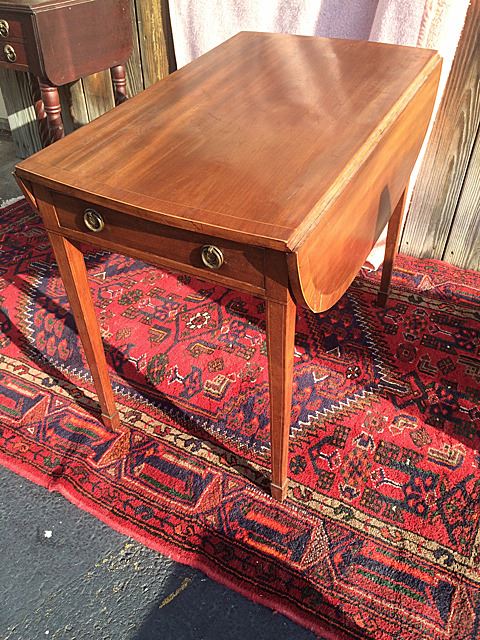 Antique Hepplewhite drop leaf table with 1 drawer, banded inlay, all in mahogany. Measures approx. 30" long x 20" wide (10" leaf) x 27 1/2" tall.