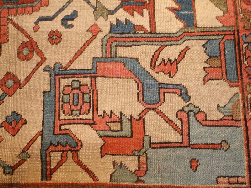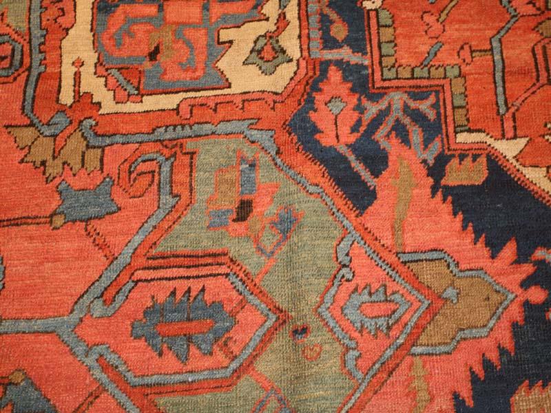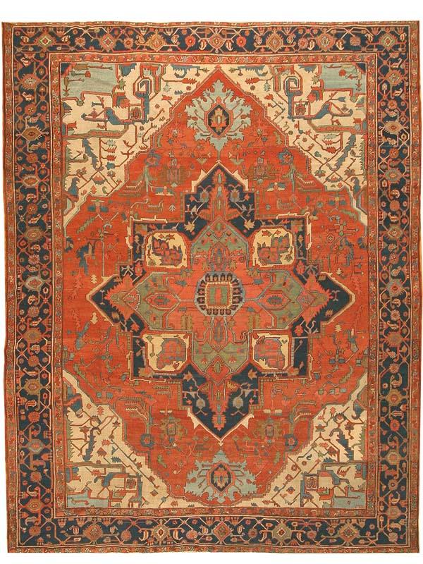 11.02 x 14.05 Late nineteenth century Antique Heriz/Serapi, Persia -On this classically elegant antique Serapi, a star-like medallion in shades of red, green, and blue hovers at the center of a soft red field, surrounded by delicate vines and palmettes in soft green. Ivory cornerpieces complete the field design, but filled with elements whose colors repeat the palette of the medallion and field. The vinescroll border also recapitultes the details of the field as well as the rich blue of the outer medallion, to produce a harmonious yet powerful frame for the monumental scale of the central design.