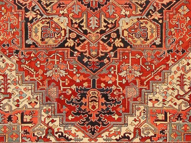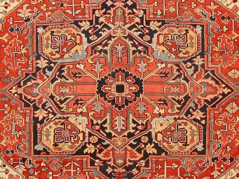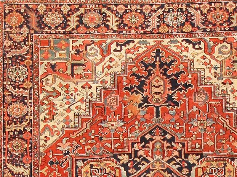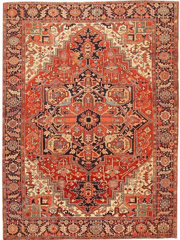 8.08 x 11.04 Circa 1920 Antique Heriz Serapi Persian Rugs, Persia - Heriz (Serapi) carpets are among the most recognizable rugs of Iran because of their distinctive monumental designs and the expressive power of their angular drawing. They tend to have strong medallion designs accented through the use of color, but allover Herizes are not uncommon. Herizes rely on floral patterns with strapwork vines and grand palmettes with zig-zag contouring. Where other Persian carpets would utilize a curved form, Herizes will apply series of angular twists and turns, imparting an emphatic geometry to the design. Herizes have glorious color, with rich reds, blues, greens, and yellows resonating against ivory. Much of the formal vocabulary, drawing, and color sensibility of Herizes is traceable to the classical Caucasian carpets of the seventeenth and eighteenth centuries. Since the Heriz region of northern Iran is is not far from the Caucasus, it is not surprising that Heriz carpets have preserved so much of the Classical Caucasian tradition. Some Herizes, however, especially those produced in silk, display a different drawing and design vocabulary linked to other types of Persian carpet. They are identified as Heriz rugs primarily by their weave.