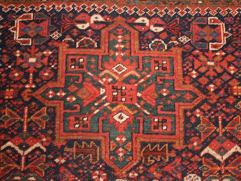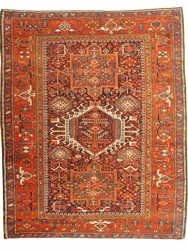 4.09 x 6.02Late nineteenth century Antique Karajeh Heriz Rug, Persia - Three medallions reign supreme across the field of this crisply elegant antique Heriz, surrounded by a welter of smaller medallions and tiny floral fillers. The star-like medallions above and below the central one indicate that this rug belongs to the Karajeh group of the Heriz family. The ‘turtle’ vinescroll main border offers a beautiful framing complement to the precise detail of the field, but set against a rich terracotta ground in contrast to the deep blue of the field. While Herizes are best known as room-size carpets and runner, this scatter-size example is unusual in its scale.