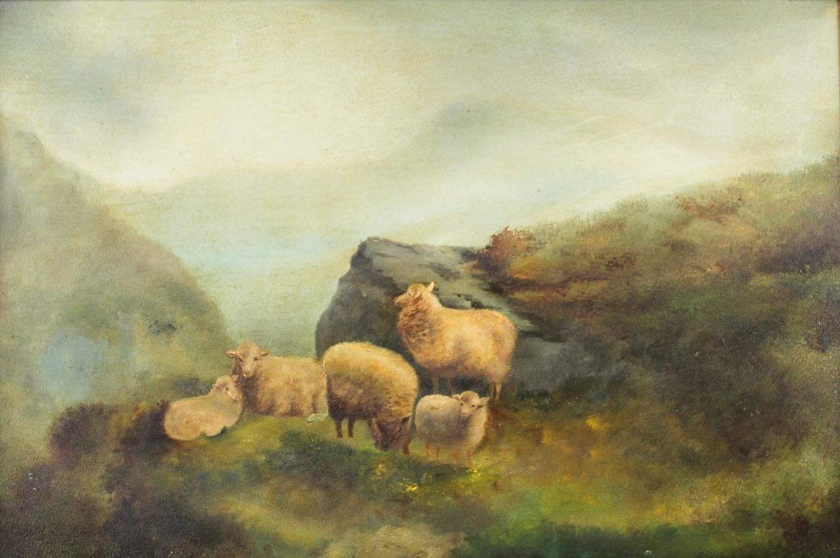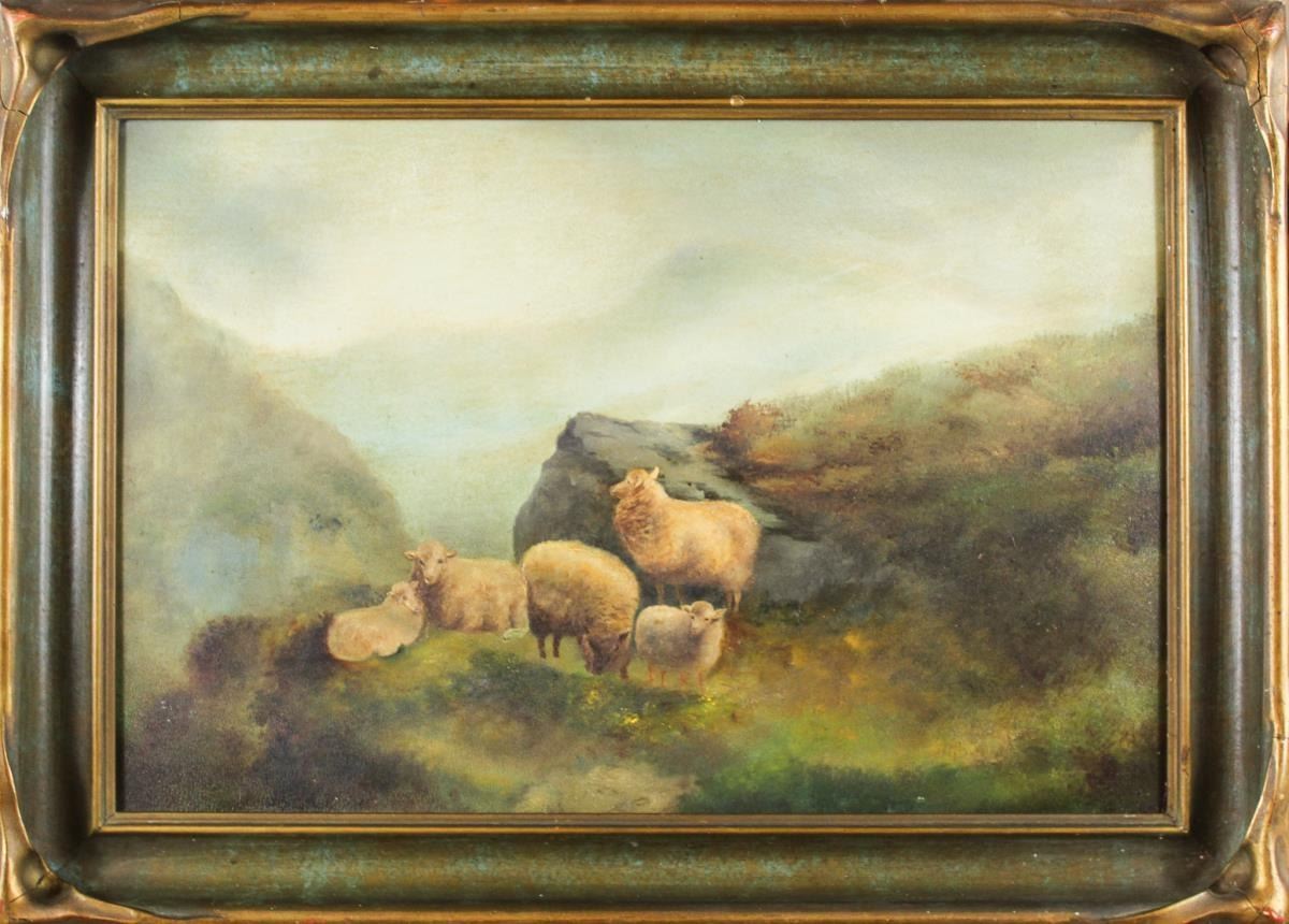 Mountainous pastoral scene of resting sheep Original frame. Appears to be unsigned, oil on panel.