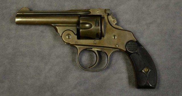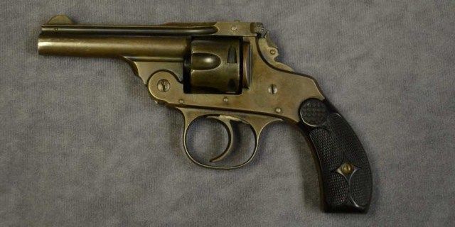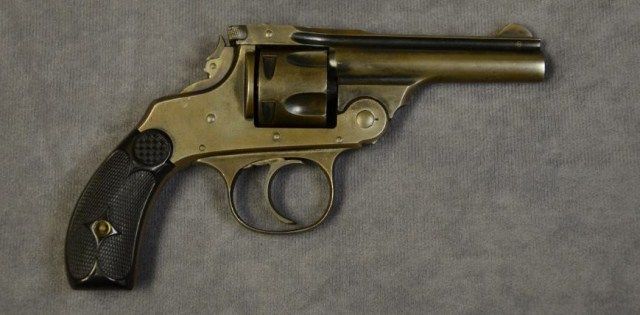 Antique Hopkins & Allen DA top break revolver with folding hammer, .32 cal., 3” barrel, blue finish, checkered black hard rubber grips, #35290. This gun is in overall very good + condition showing traces of originalblue in protected areas with balance gone to a brown patina, fine bore, crisp markings, fine action and grips; Hopkins & Allen were the manufacturers of the Merwin & Hulbert revolvers. Est.: $125-$250.