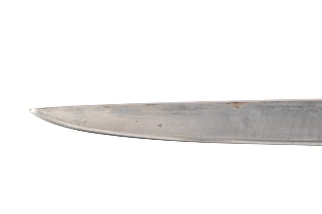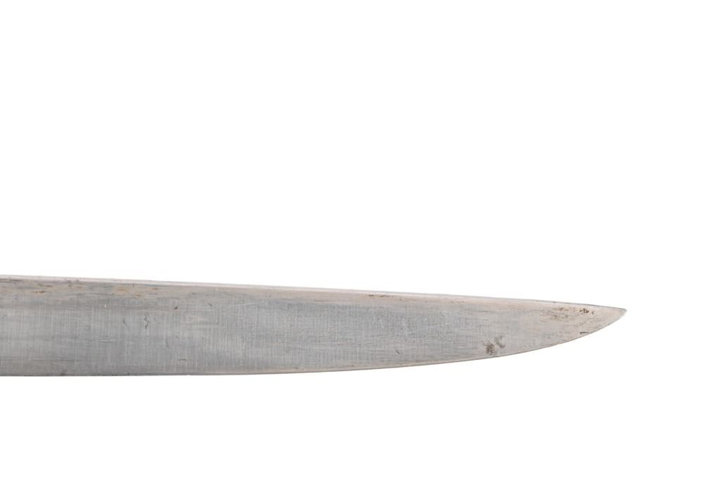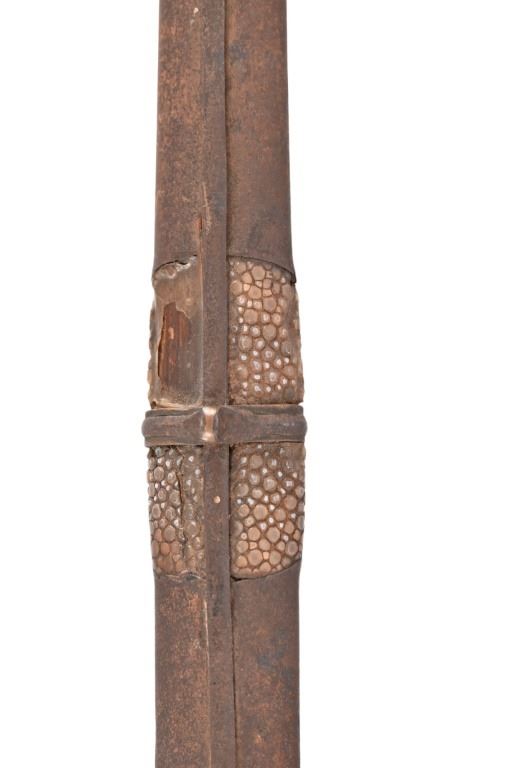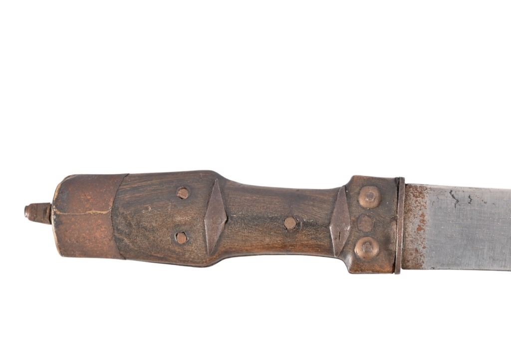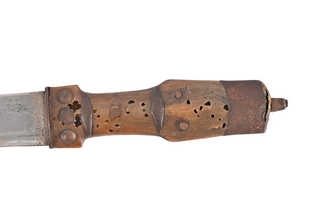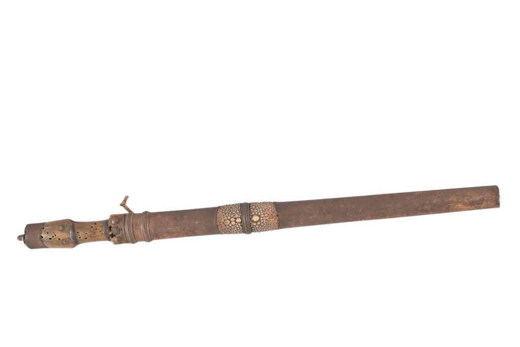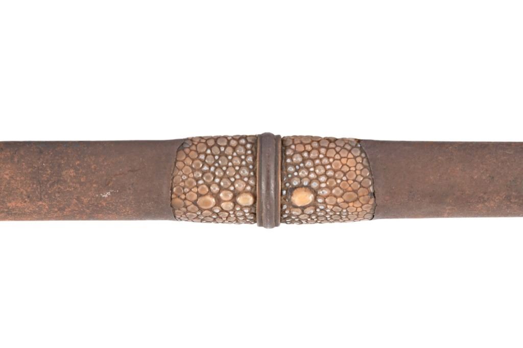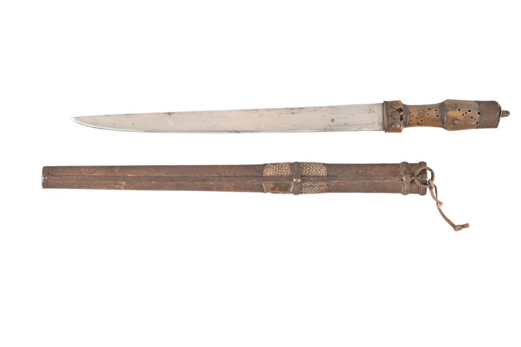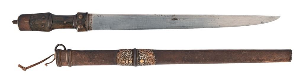 Horn handle, iron scabbard inset with reptile skin. 11 3/8" blade, overall length 16" From the personal collection of Bud Shrake