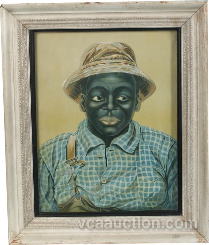 Antique Hoyt Life Picture Automaton "Black Farmer" c1885-1915, eyes & mouth move, works w/ wind-up key - 21" x 25"