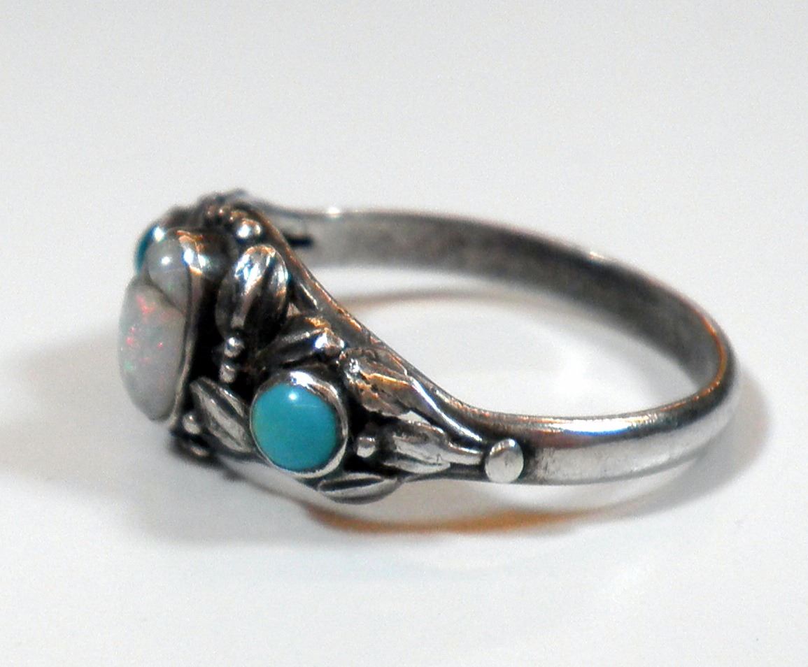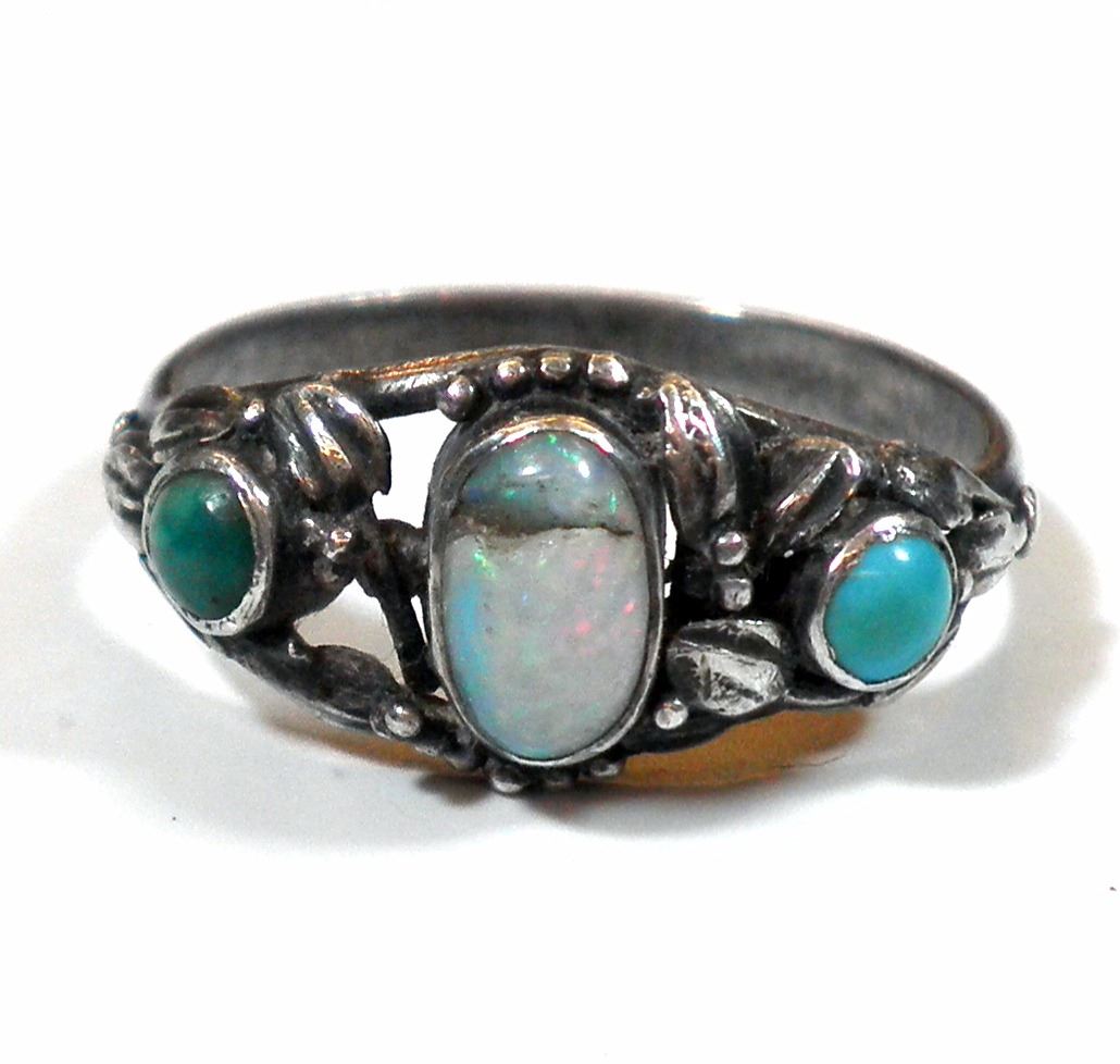 Antique Hungarian silver ring, with central opal gemstone setting and turquoise and malachite settings, unsigned: tested silver, crack in opal, size 7, weight: 2.3 gm.