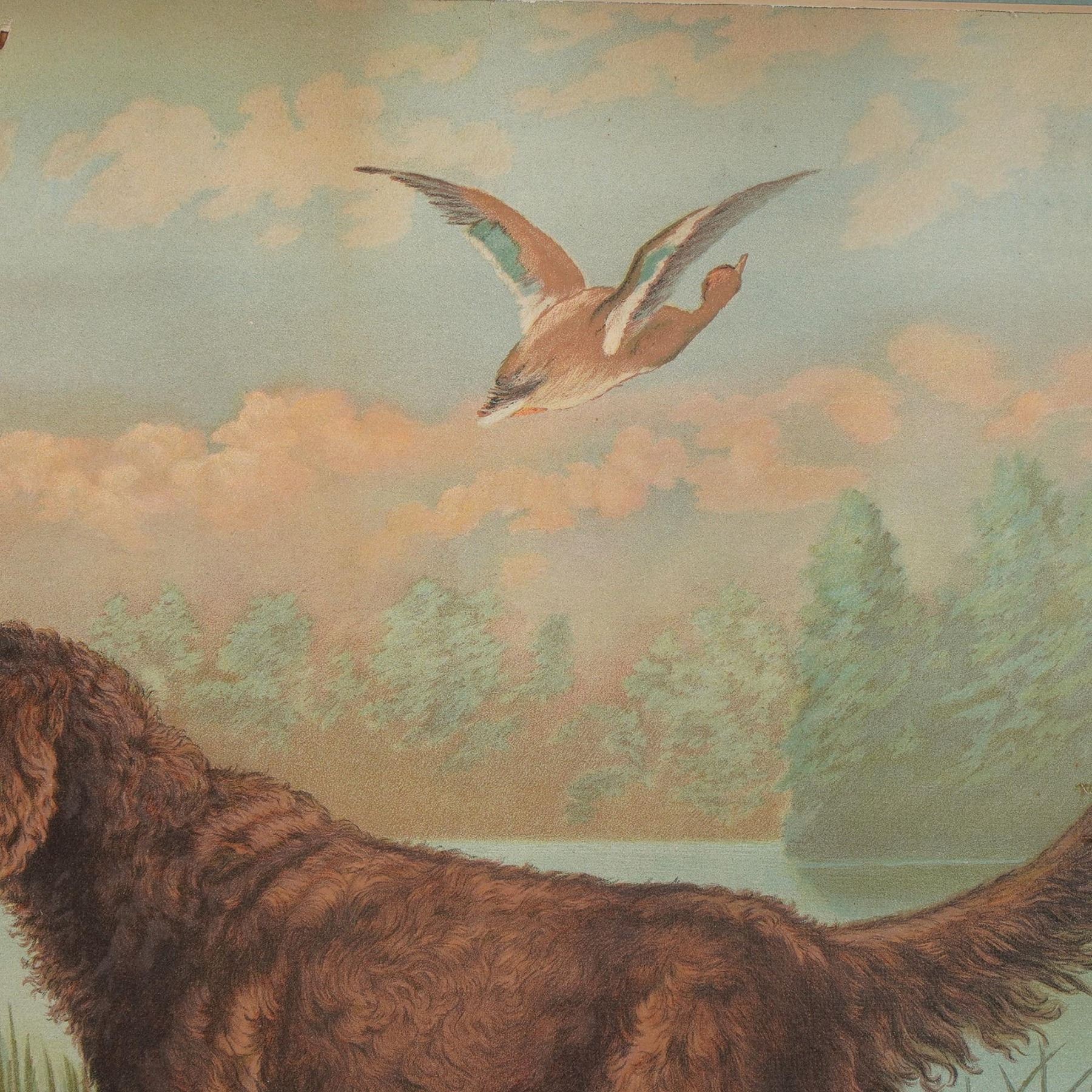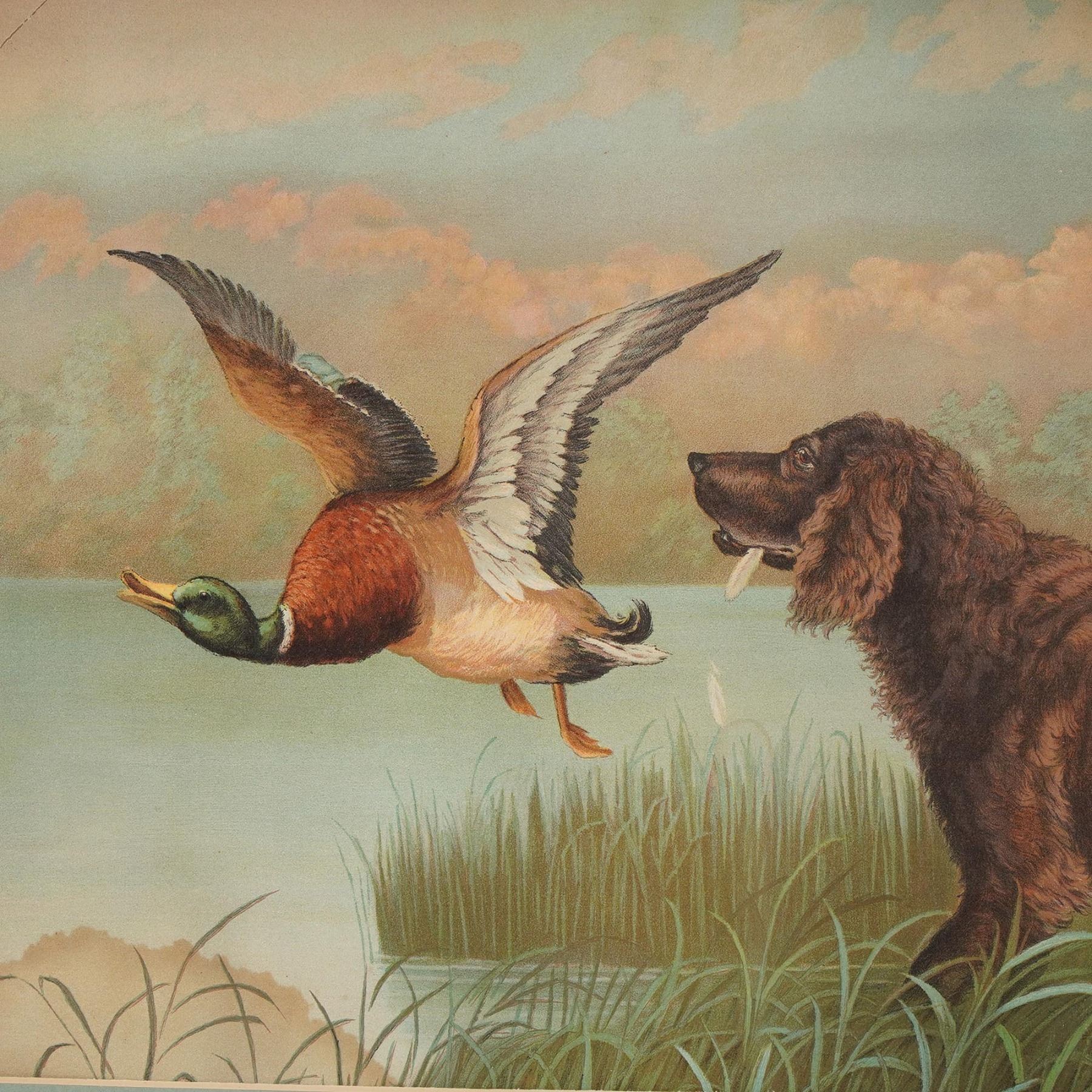 A richly detailed chromolithograph depicting a classic sporting scene of a brown retriever flushing out a mallard duck from a lakeside marsh. The vibrant image captures the energy and alertness of the hunting dog, with one duck taking flight and another soaring in the sky above a tranquil woodland background. This unframed print is presented on aged paper and mounted on a green mat. Likely late 19th to early 20th century, the artwork embodies the rustic charm of vintage American sporting prints.
