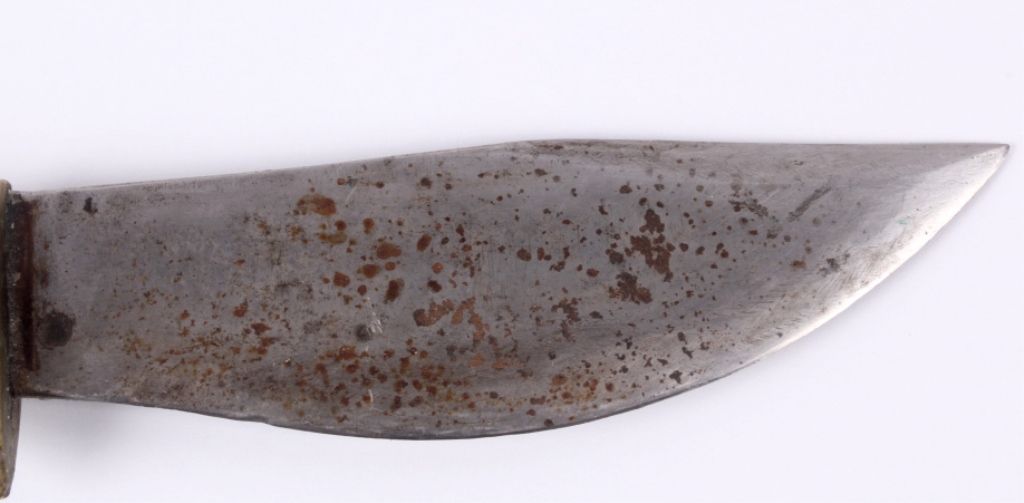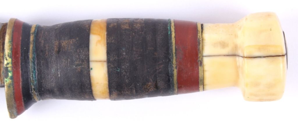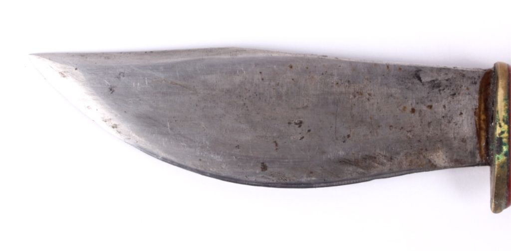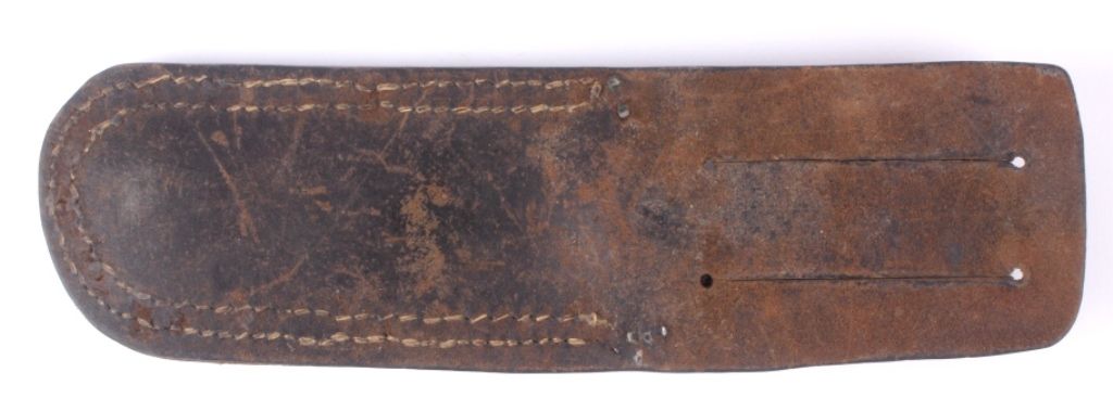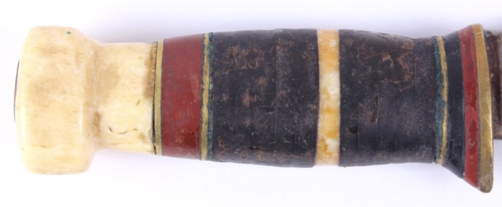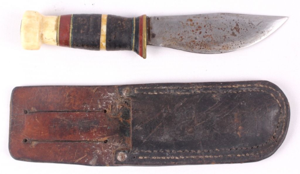 This lot features a unique hunting knife and leather sheath. Although it is not marked, it is well made with the handle being composed of brass, leather, and bone. This knife could possibly be an early Marbles. Overall lengthis 9"and the blade is 4.75".