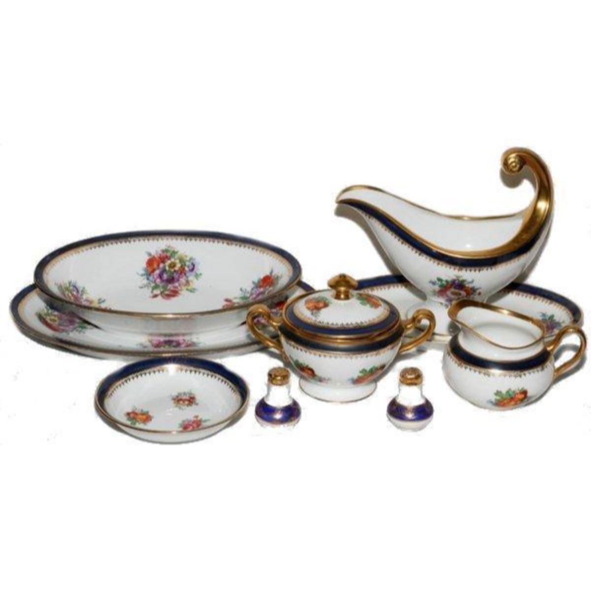 Antique Hutschenreuther Bavarian porcelain service, 13 pieces total. Cobalt with orange, burgundy, blue & lavender floral design, with gold gilt trim & handles. Includes 6 sauce or dessert dishes, 5 1/4" D, all marked "Hutchenreuther Selb, Bavaria Germany" on bottom, 1 large 10" X 6" X 8" sauce boat marked " Heutchenreuther Selb, Bavaria" on bottom, 1 - 10" X 7 1/2" vegetable bowl marked "Heutchenreuther Selb, Bavaria" onbottom, 1 - 12" X 8" platter marked "Royal Bavarian, Heutchenreuther Selb, Bavaria " on bottom, 1 4" X 5" X 3 1/2" creamer marked on bottom "Paul Muller, Selb, Bavaria", 1 - 7" X 4 1/2" X 4 1/2" covered sugar bowl marked on bottom "Huetchenmeuller Selb, Bavaria" & a set of cobalt & gold gilt salt & pepper shakers marked on bottom "Czechoslovakia."