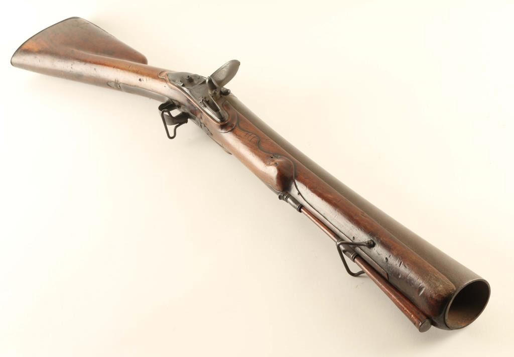 Ornate English made 18th century flintlock blunderbuss. Features a London proofed 17.5" iron barrel with 1 7/8" flared muzzle, smooth trigger, no hammer, "I/HARRISON" marked lock, floral scroll contoured left side plate, metal capped wood ram rod, sling swivels, and full-length straight grip shoulder stock with bulged grasping points on the forend & smooth metal buttplate. The metal surfaces display an pleasant aged brown patina with scattered pin prick pitting. The action is non-working with the missing hammer but the other components appear to be in good working order, the bore is clear and the wood stock is good showing blemishes & small losses with no major defects observed. Condition is NRA Good. ***Antique Firearm***