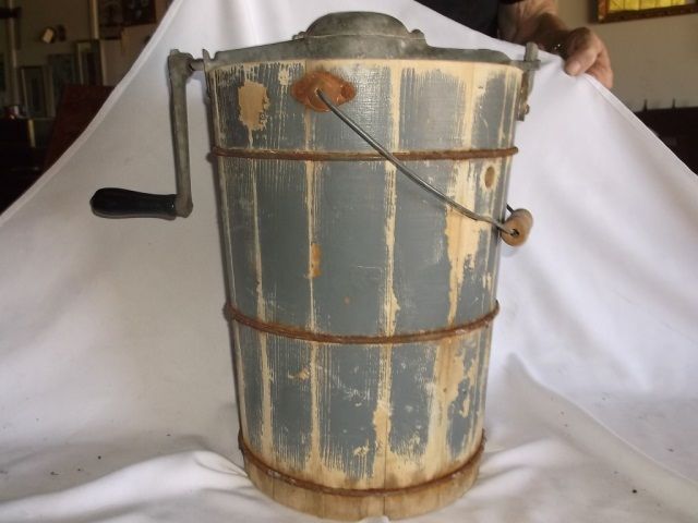 Very old wood bucket ice cream maker in working order approx. 14" round x 16" tall