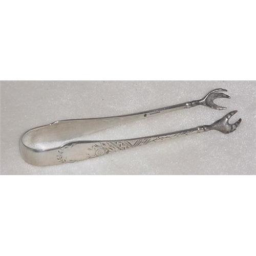 A pair of Victorian era sterling silver ice tongs, 6" long, with floral pattern and bird claw tongs, The mark looks to be a towle sterling mark. The word sterling is impressed. Condition is very good.