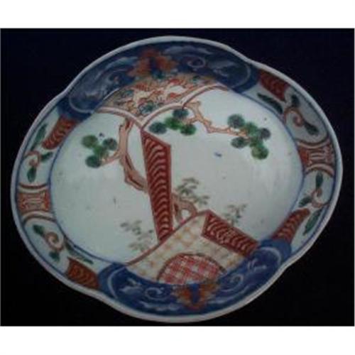 Edo period, circa 1850, Imari porcelain dish with underglaze and over glaze decorations. The dish has a scalloped contour and is decorated with a pine tree and a cartouche above, and below having floral decorations. A blue under glaze scroll, decorates the reverse. Dimensions: 6.2 inches x 5.4 inches. Estimated value: $500.