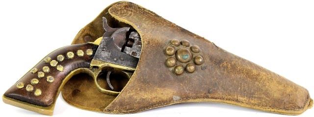 SN 48372, revolver with 5" barrel, partial visible cylinder scene, semi functioning action, walnut grips with period forged tacks to both left and right sides.