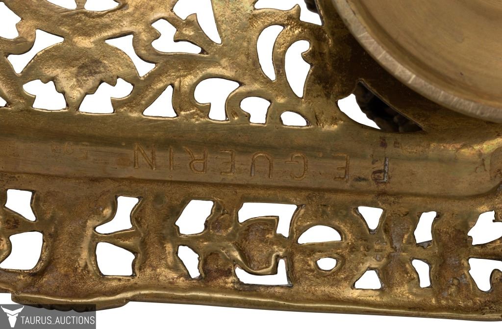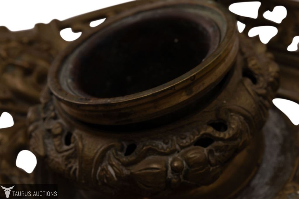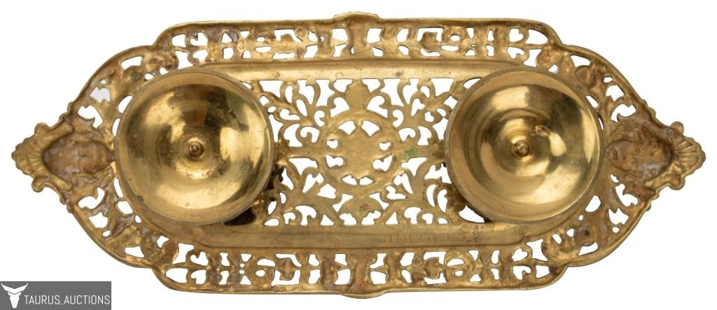 Item/Description: Victorian PE Guerin New York brass desk inkwell with two pots. Features pierced, chasing and repousse work. Base marked P.E. Guerin 504.