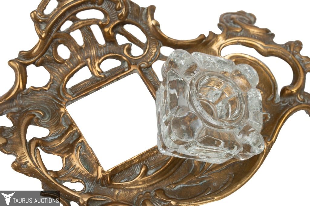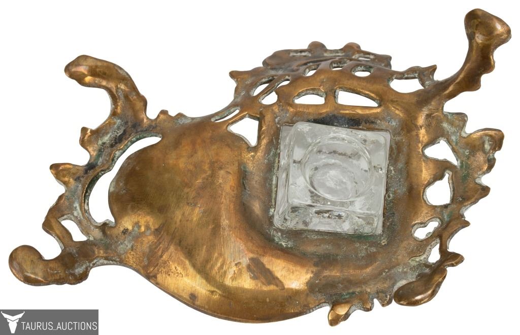 Item/Description: Ornate Art Nouveau brass inkwell. Open pierce-work design, organic swirls, floral vines. Center heavy lead clear crystal. No visible signature or hallmarks.