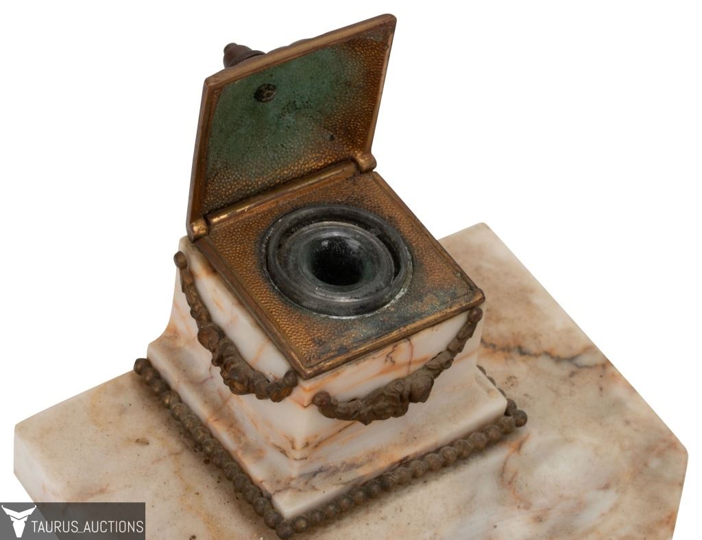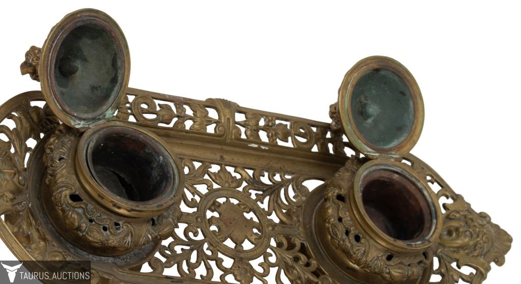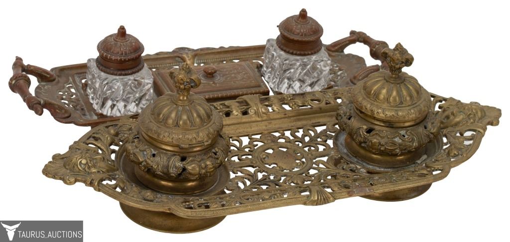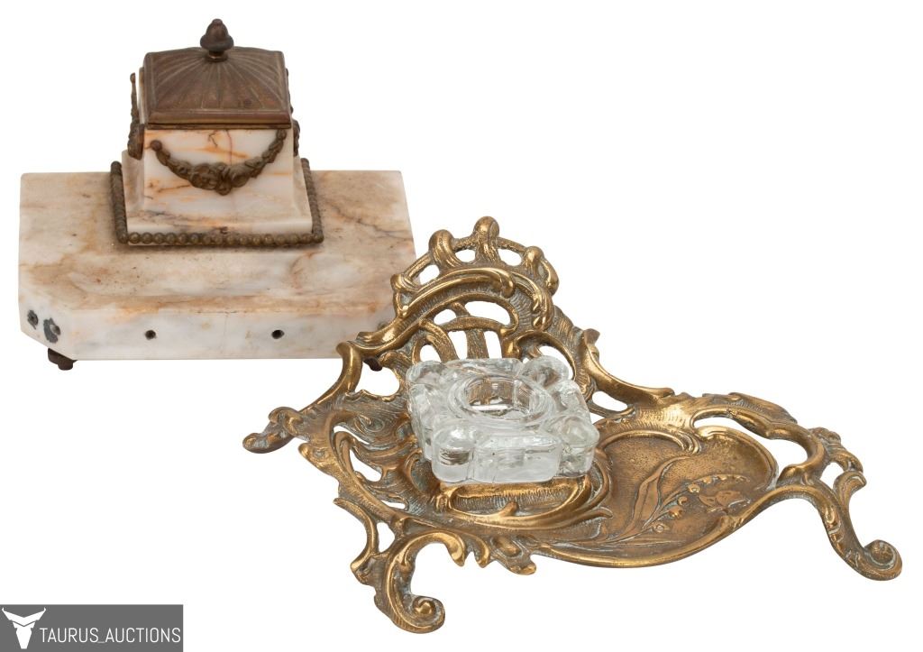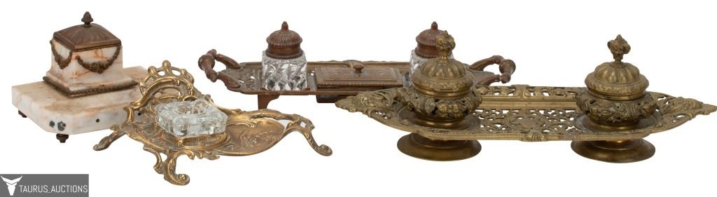 Item/Description: Lot of four inkwells includes: P.E. Guerin Brass Double Inkwell, Marble Single Inkwell, Art Nouveau Rococo and a Neoclassical Double Brass Copper Inkwell.