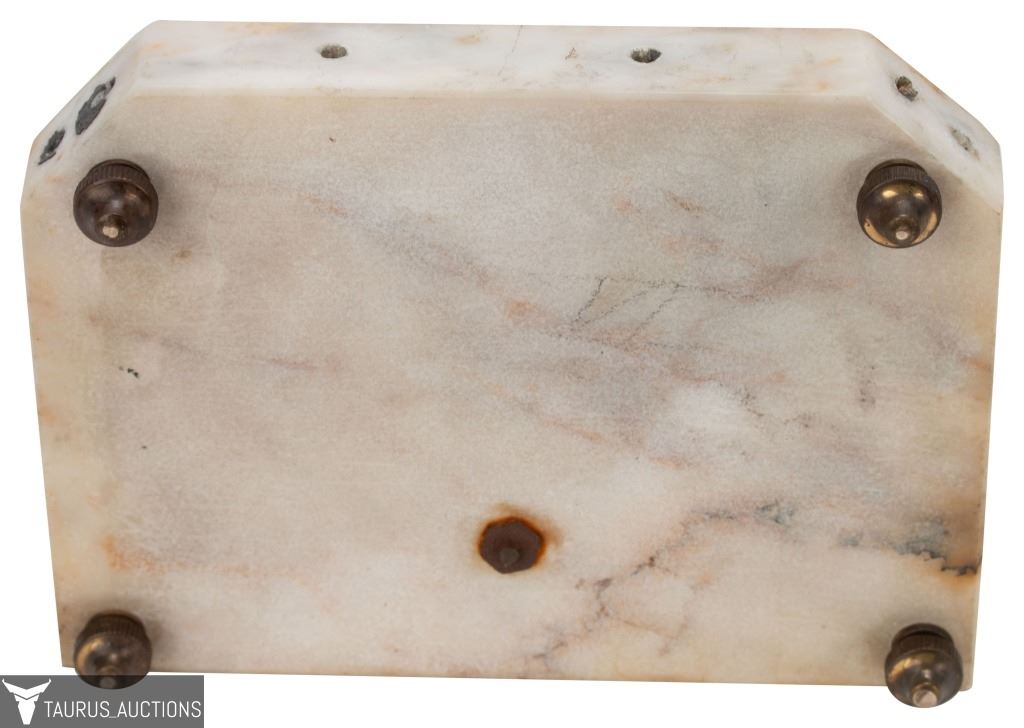 Condition: Good. Inkwell intact. Hinged lid opens and closes smoothly. Glass inserts intact, free of chips. Signs of age, use and surface wear including loosening to front brass garland, oxidation, patina, surface debris, six drill holes around base where a decoration might have been.