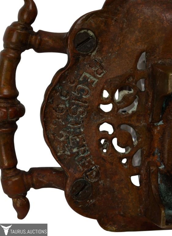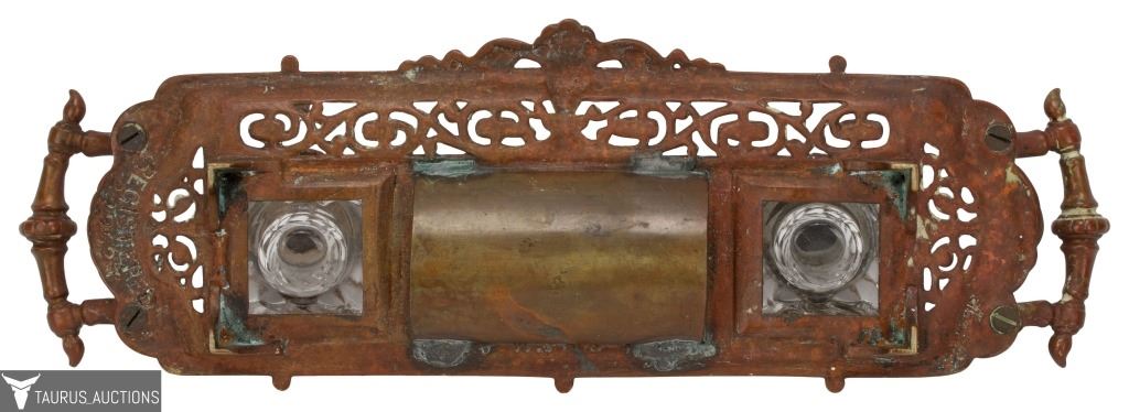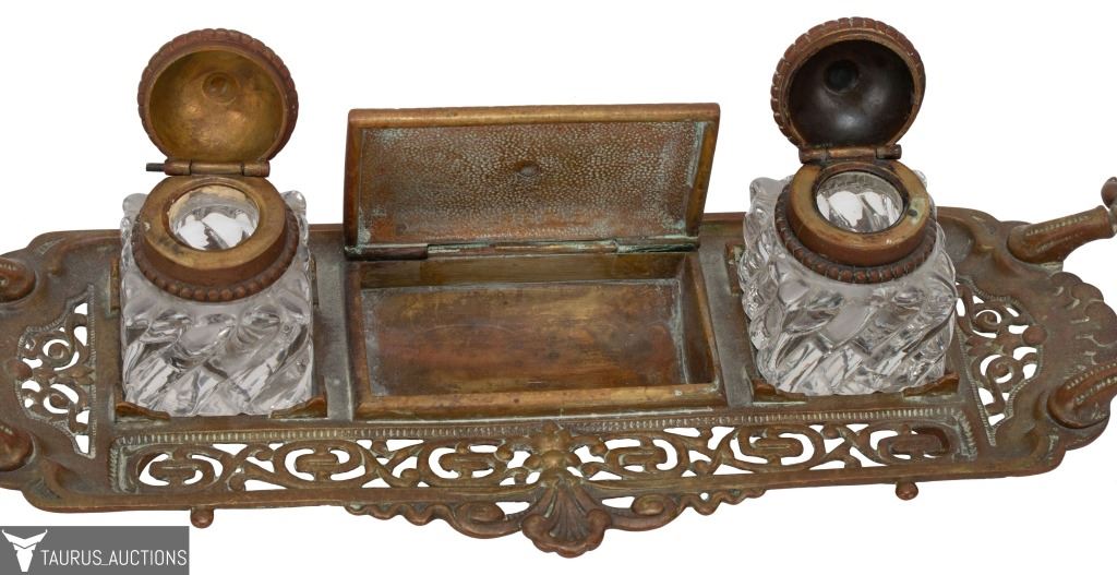 Item/Description: Antique Neoclassical Double Brass Copper Inkwell. Hinged lids with lead crystal jars. Middle section for stamps, paperclips, hinged lid. Hallmarks on base includes: Registered 229627; W.I.O.S. ( partially visible); additional numerical serial number