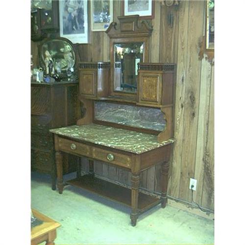 Antique Inlaid Marble Top Desk. This is a turn of the century desk and in great condition. It does have one, very small nip out of the bottom front marble, besides that, it is simply beautiful. It is very old and detailed and inlaid so nice. Has marble on top of desk, on back side of it, and it is so colorful. It is made up of two different types of wood, completely Inlaid and all carved on top and all thru out. The photos say it all. It is 76" H X 48" W X 24" Deep. Has a 1 1/2" inch beveled mirror, so you know it is very old. Come in three pieces, so easier to set up and take down. Simply a beautiful item and you don't find many like this. A great add to any home or business. Hope you enjoy it as much as we do.