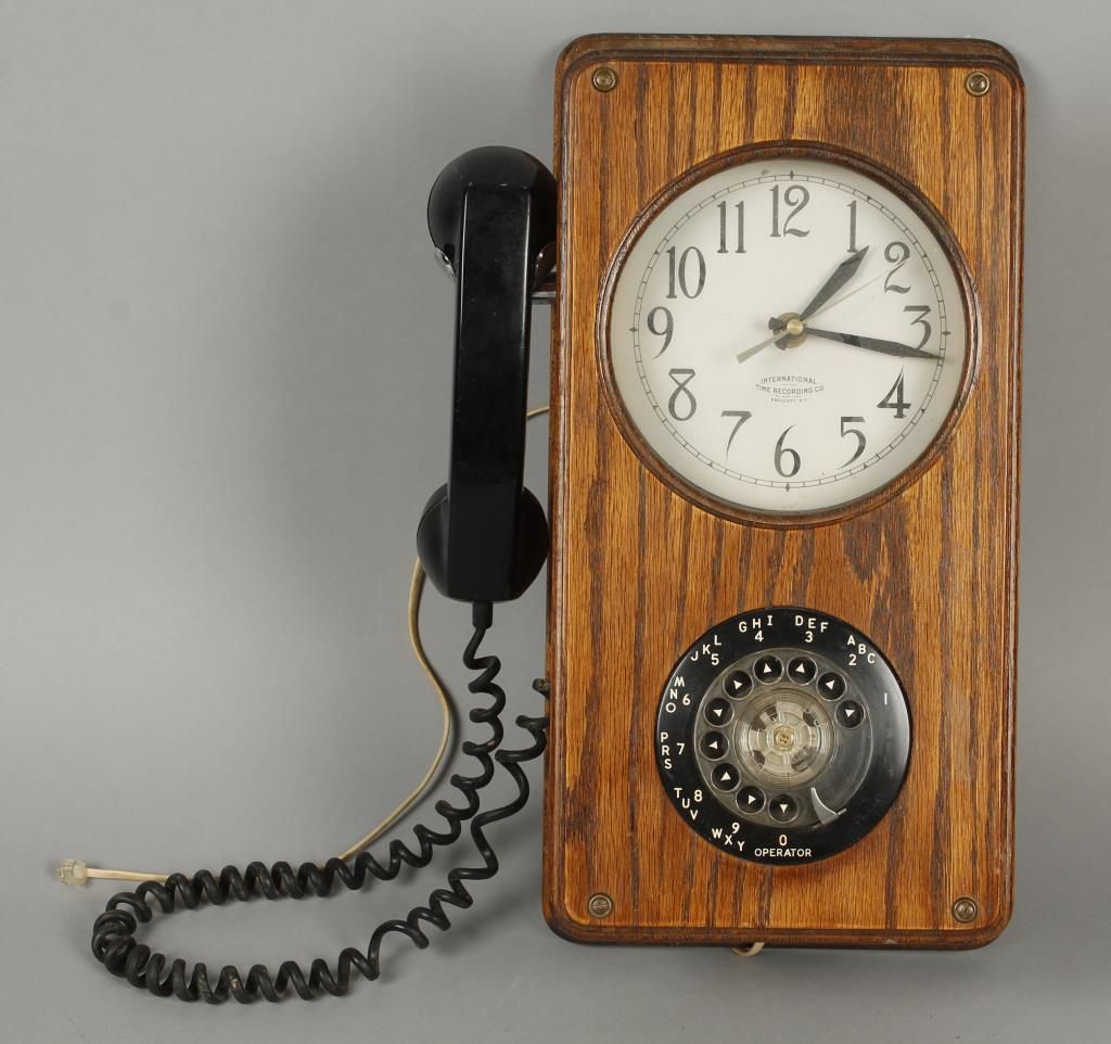 Telephone. Oak cased in working condition with rotary dial,with built in clock.