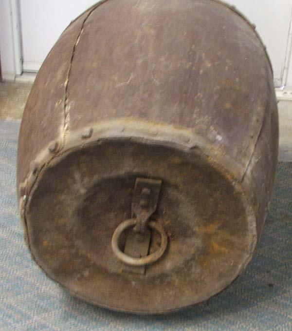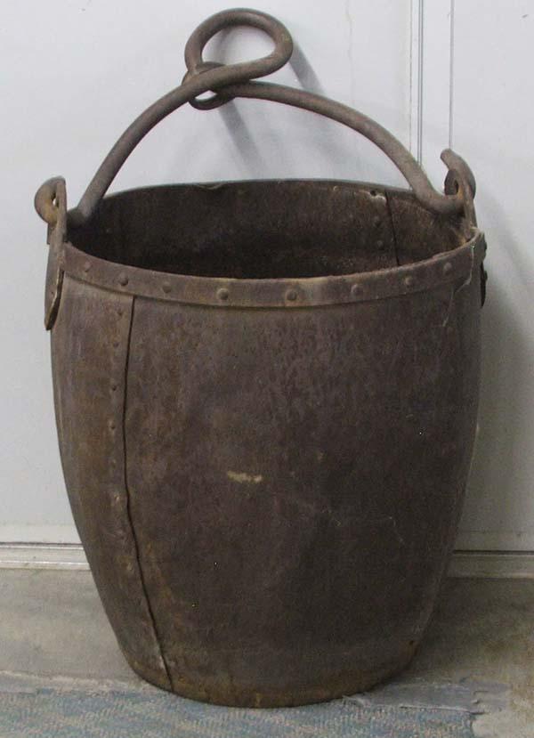 Antique Iron Ore Bucket. Has ''D Ring'' on bottom for emptying bucket. The bucket measures approx. 22'' diameter and 24'' high (without handle). MUST BE PICKED UP.