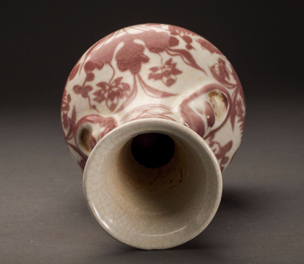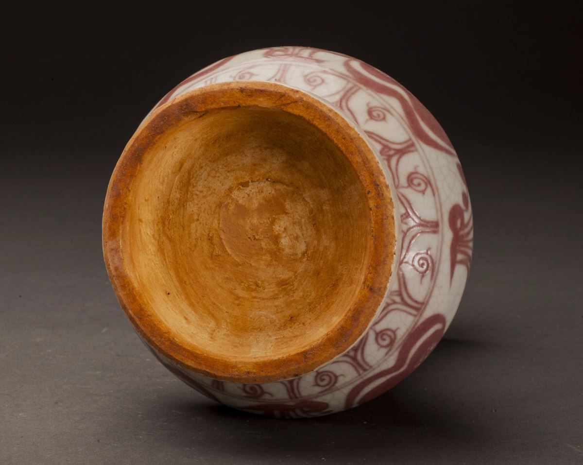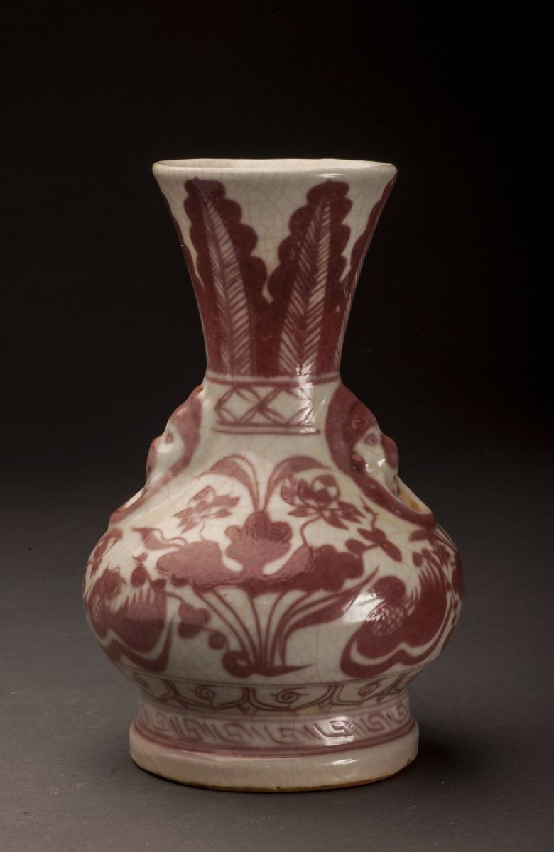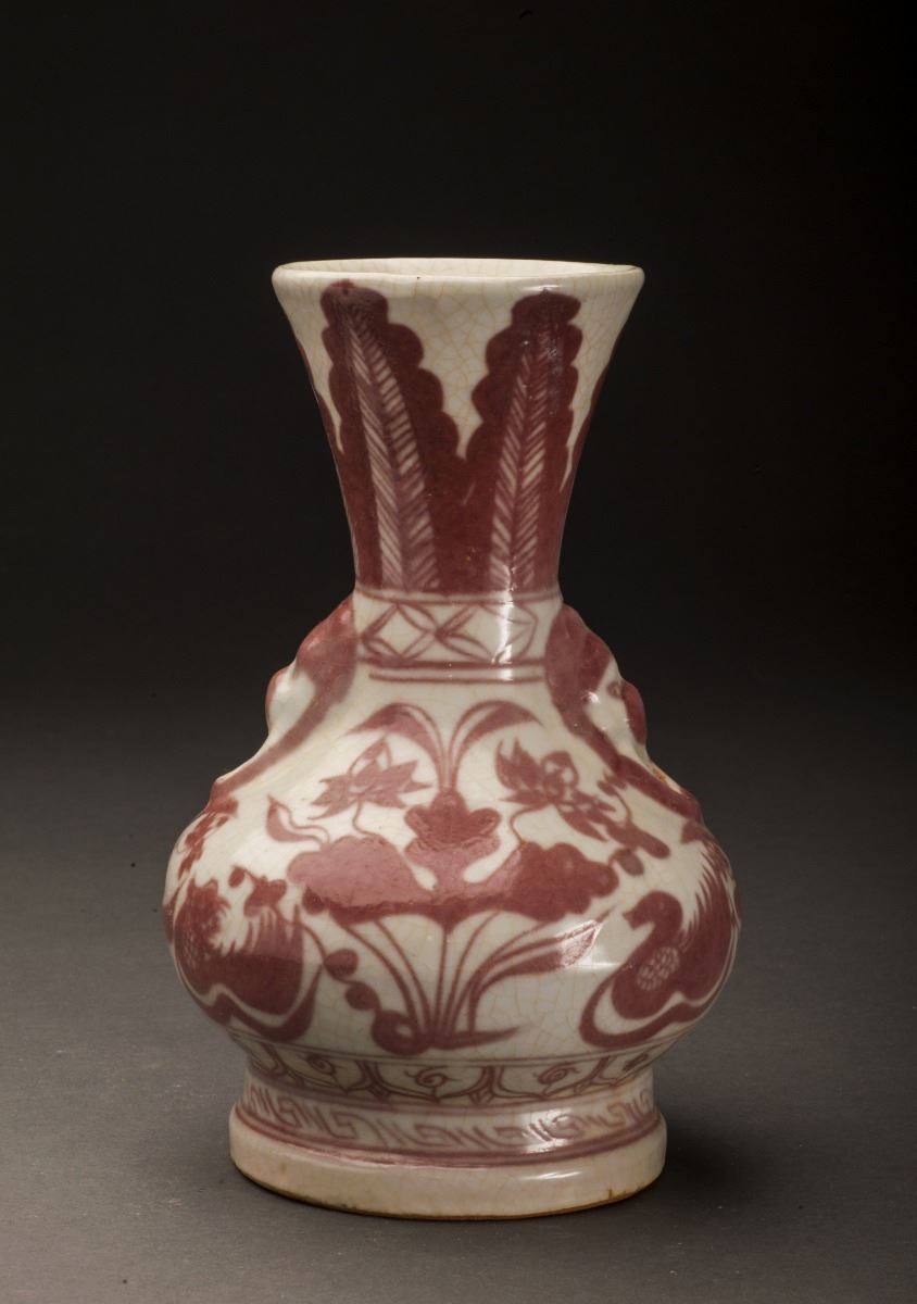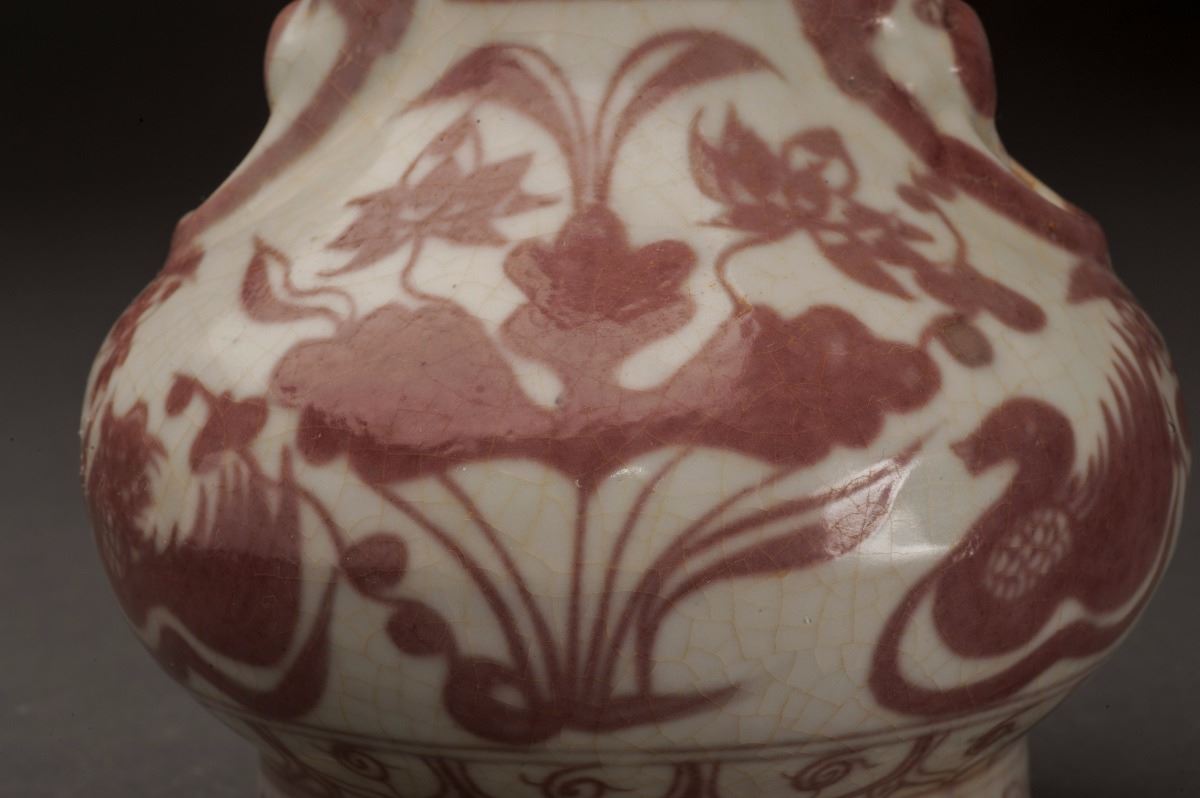 Slightly Flaring Mouth At Top, With The Large Leaves Patterns At The Neck. This Fine And Rare Iron Red Glazed Porcelain Vase With Vivid Ducks And Flowers At The Finely Potted Cavetto. Two Unique Designed Handles At TwoSides Of The Bottom Of Neck. Raised On The Short Foot On Bottom.