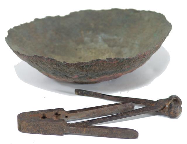 Circa 1900, Two old bullet presses/forms plus a copper bowl. Dish 2" x 7"