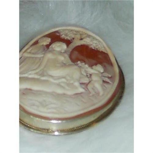 A very large Italian carved shell cameo set in an 800 silver bezel frame that allows you to wear it as a pendant or a pin. The Goddess is getting her hair washed by a maiden as a Putti angel tries to sell her love.