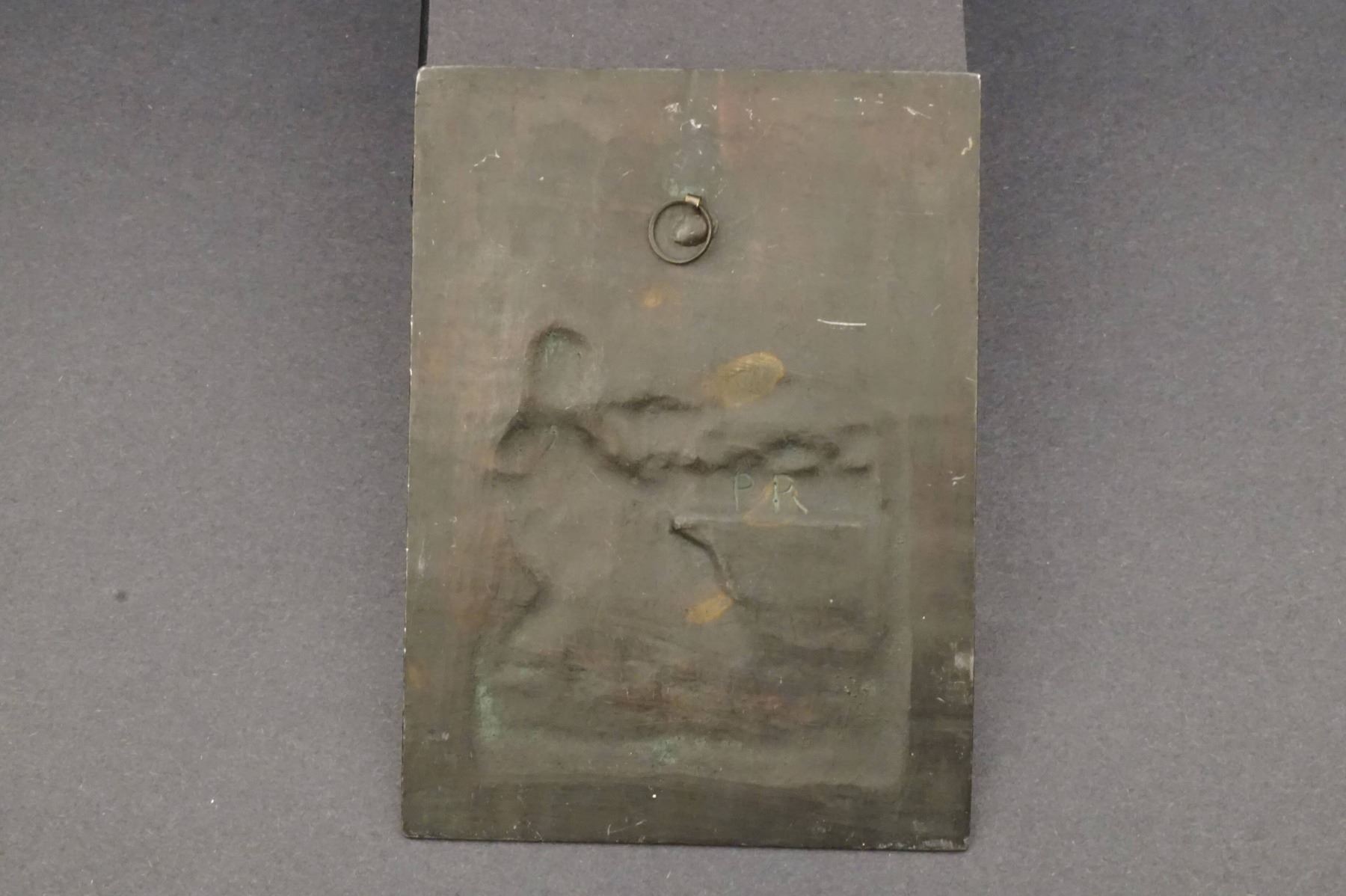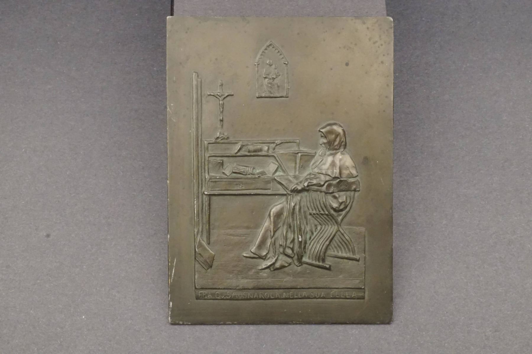 Antique Italian Copper or Copper-plated Uniface pushed Wall Plaque, Brother Girolamo Savonarola in his Cell, Measures 120 x 162 mm. Weighs 355.6 grams. Reverse has an attached hook for wall hanging. Frond shows Brother Savonarola, robed and seated in a circular chair, holding a book, in front of a simple desk that holds a few other books. Atop the desk, on the left, is a large crucifix on a stand. On the wall behind, a plaque of the Virgin and Child. Below the design is a line of text, in Italian: FRA. G. SAVONAROLA NELLA SUA CELLA. Brother Savonarola, leader of a puritanical reform movement, became the effective ruler of Florence from November 1494 until his execution by hanging and burning, with two of his followers, in the public square of Florence on May 23, 1498. He was 45 years old. The movement he started continued underground long after his death. and today he is considered one of the precursors of the Protestant Reformation.